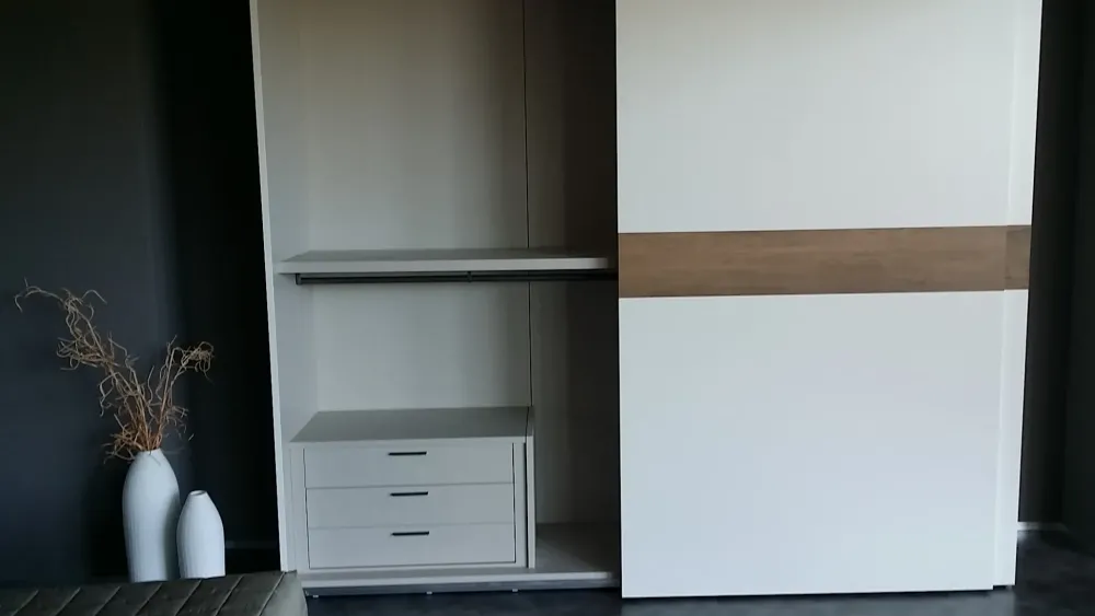 – armadio a 2 ante scorrevoli in finitura mt. opaco bianco con inserto orizzontale in mt. nodato chiaro, struttura in tamburato con finitura interna in tramato, spalle spessore 25 mm., ripiani spessore 40 mm. attrezzatura interna : n.2 ripiani, n.4 tubi appendiabiti e n.4 cassetti, misure d’ingombro cm. 280x67prof.x258h.