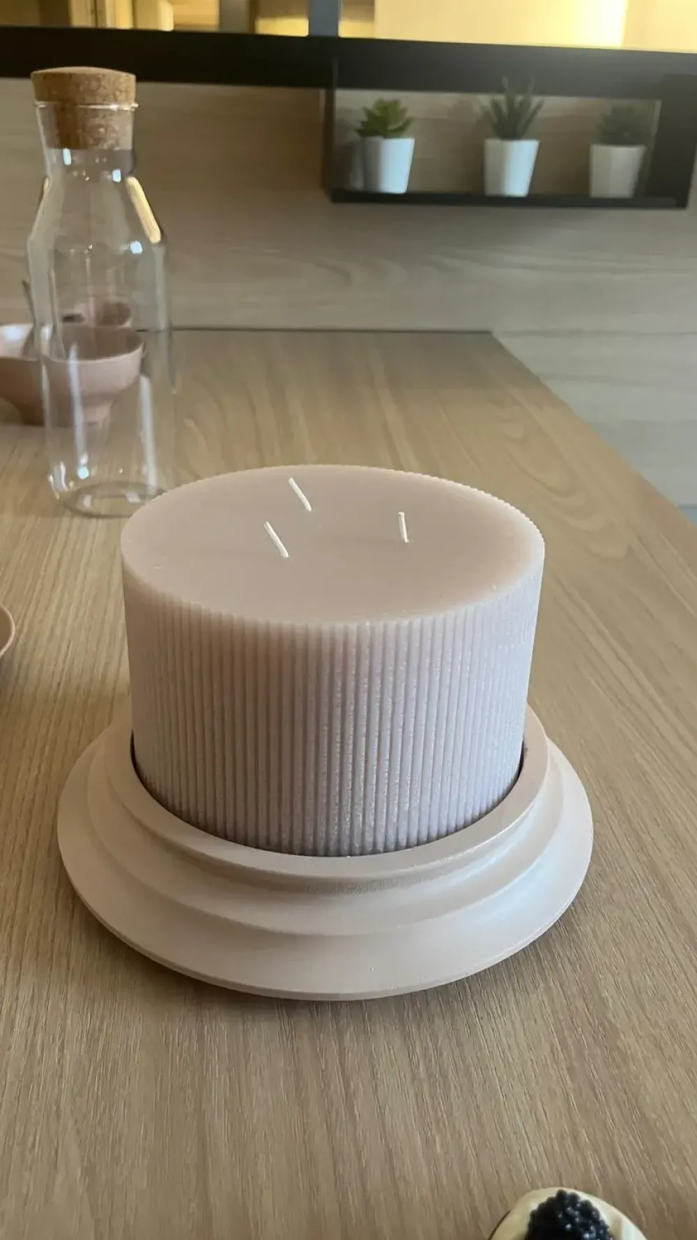 candela rosa grande con decorazione dorica accompagnata da piatto sottostante della stessa colorazione
