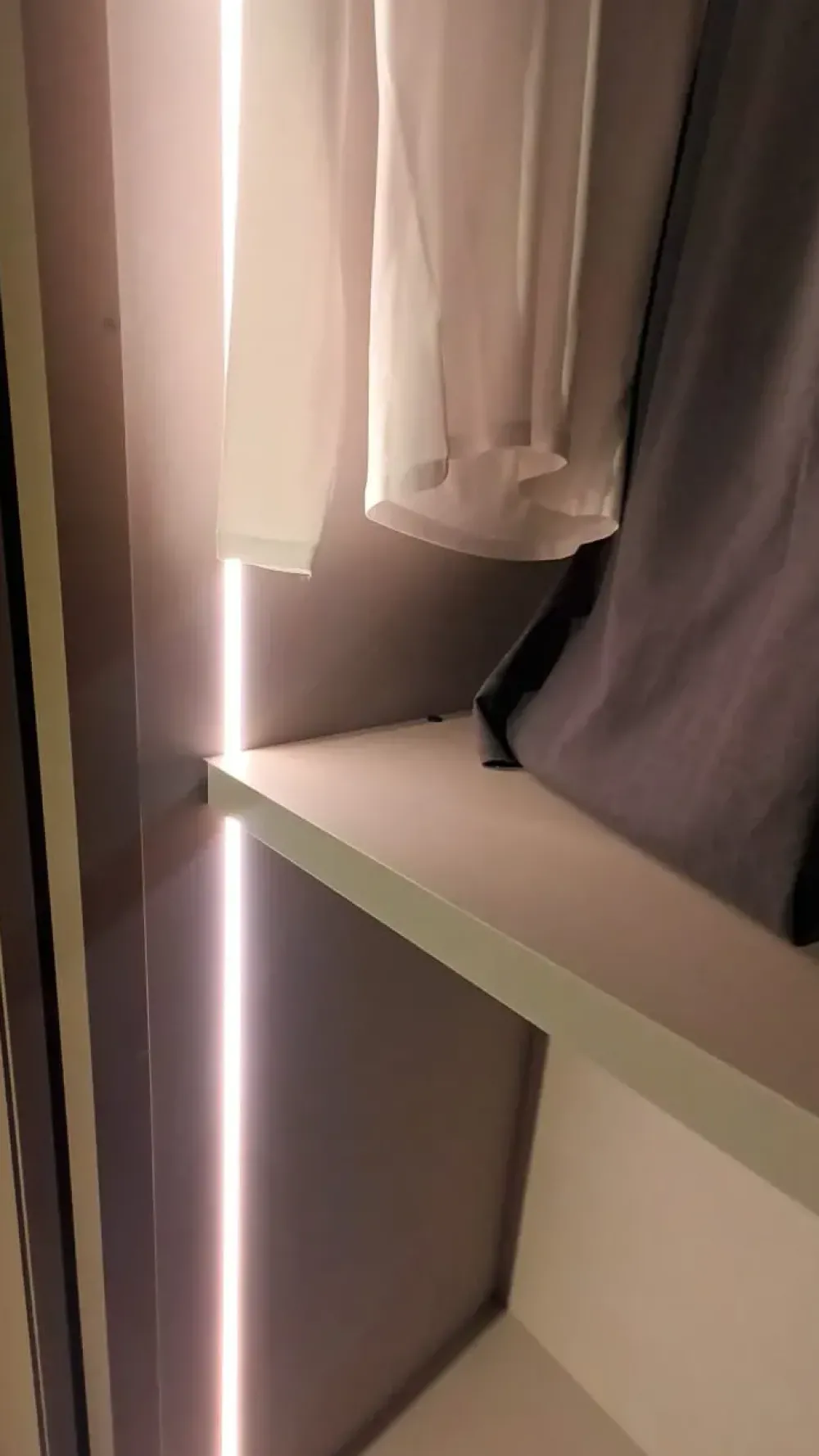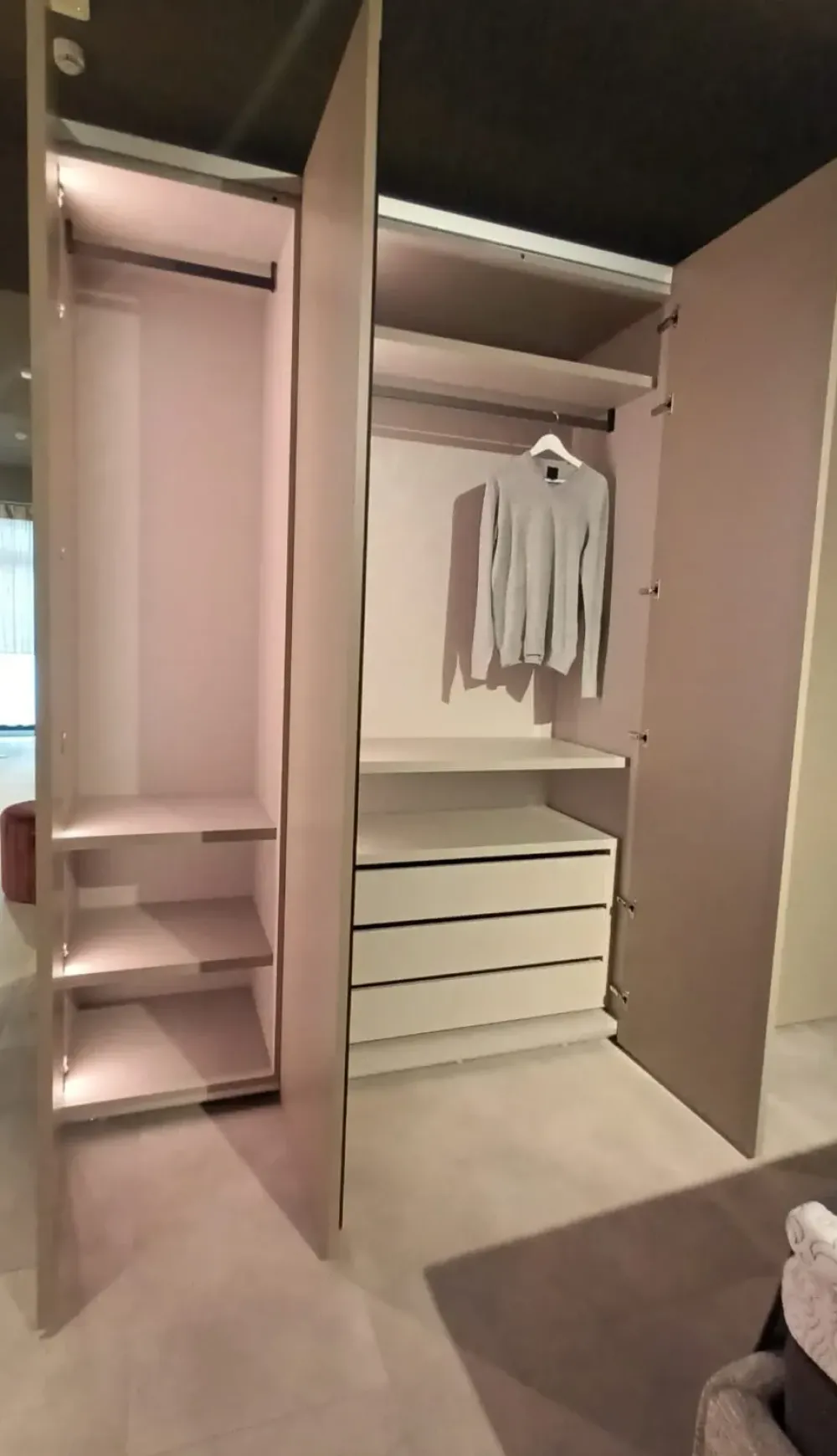 Accessoriato internamente con una cassettiera, 6 ripiani, 3 tubi per appenderia e led interni a sensore.