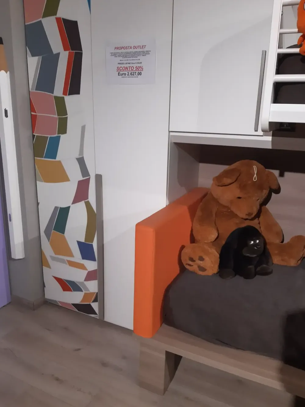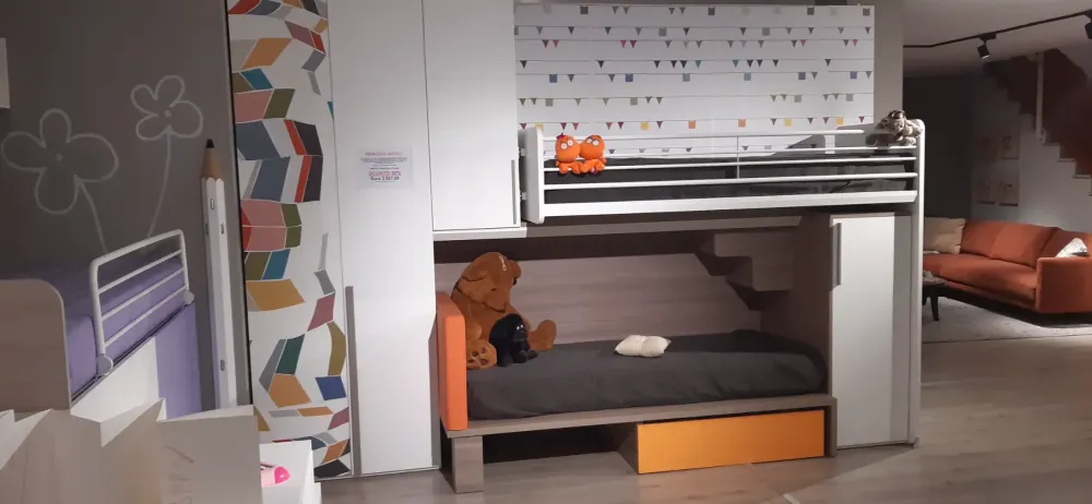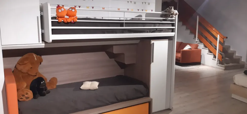 Armadio due ante a terra più un elemento a ponte ed un elemento basso a destra della composizione; letto basso con testiera imbottita e rivestita ecopelle mandarino completo di ampio contenitore estraibile; letto alto con rete a doghe, scorrevole e facilmente raggiungibile tramite la comoda scaletta nascosta. Quest’ultima sparisce nel momento in cui il letto superiore è tenuto chiuso aderente al muro, ma è molto utile per poter rifare comodamente anche il letto più in alto.