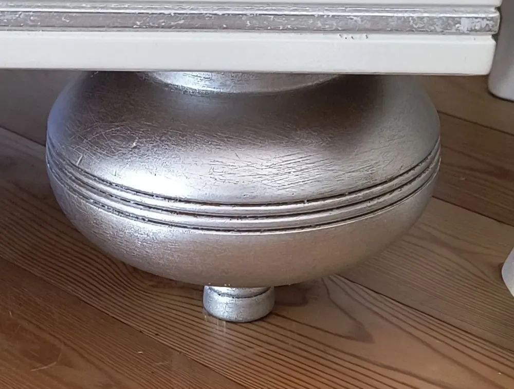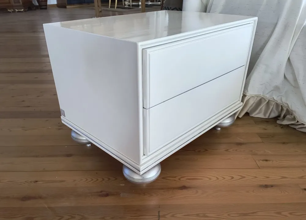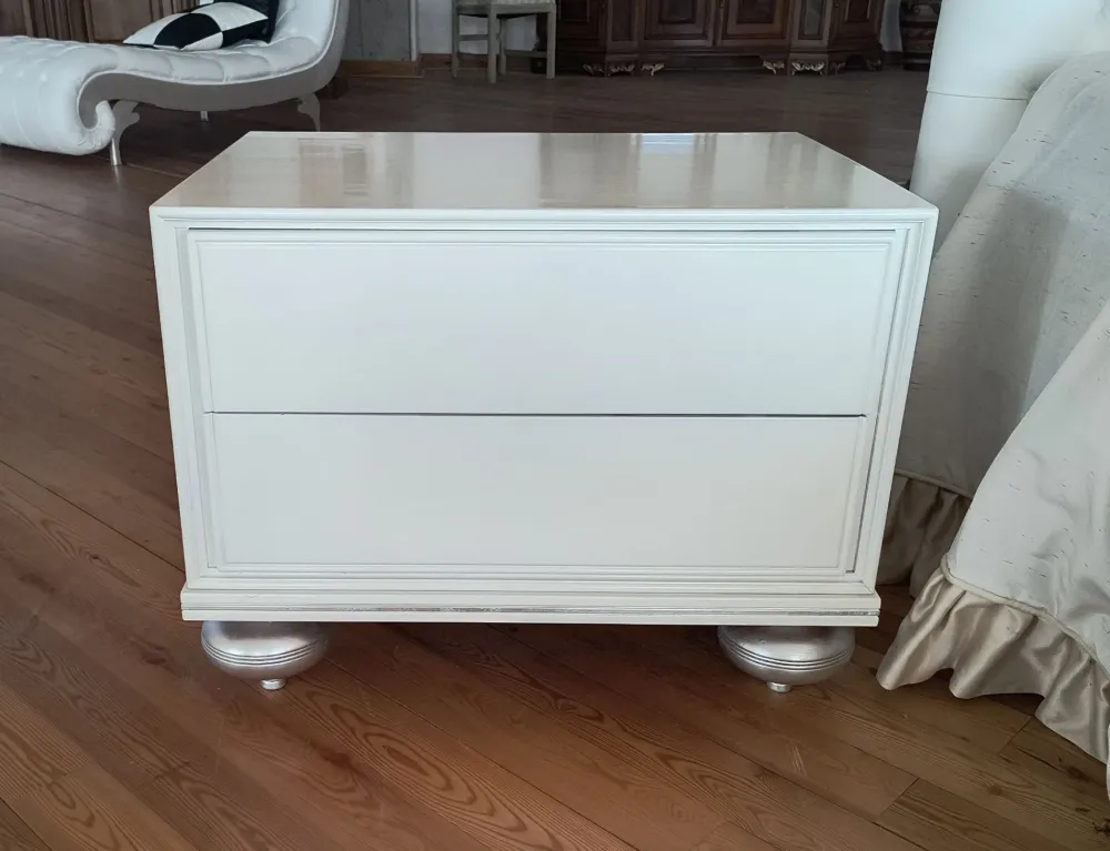 Comodino in legno laccato bianco con piedini a cipolla finiti in foglia argento , prodotto artigianale , finito interamente a mano , misure 65x48x50h , guide cassetti in legno con impugnature laterali , no PUSH-PULL, TRASPORTO INCLUSO NEL PREZZO N° 2 PEZZI DISPONIBILI