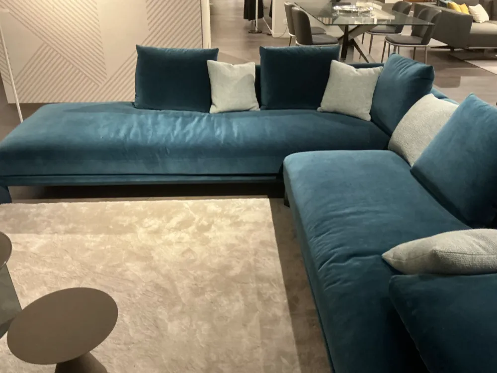 Super occasione! Divano Altana di Lago angolare sfoderabile L. 270×275. Rivestimento in bellissimo tessuto vellutato blu ottanio completo di cuscini come foto.
