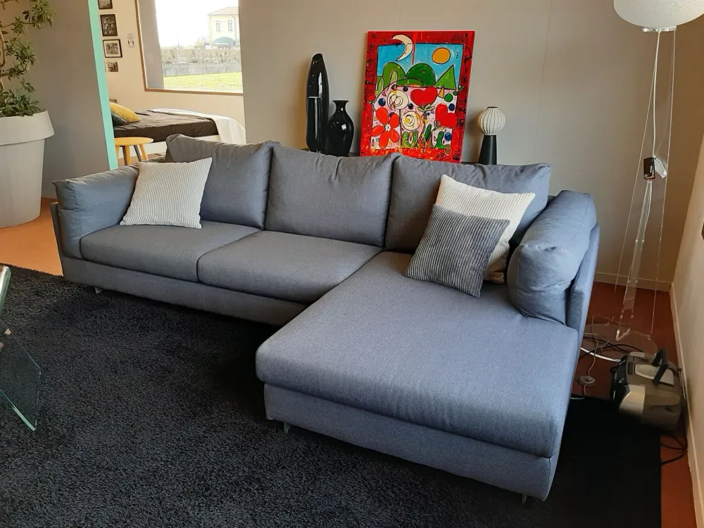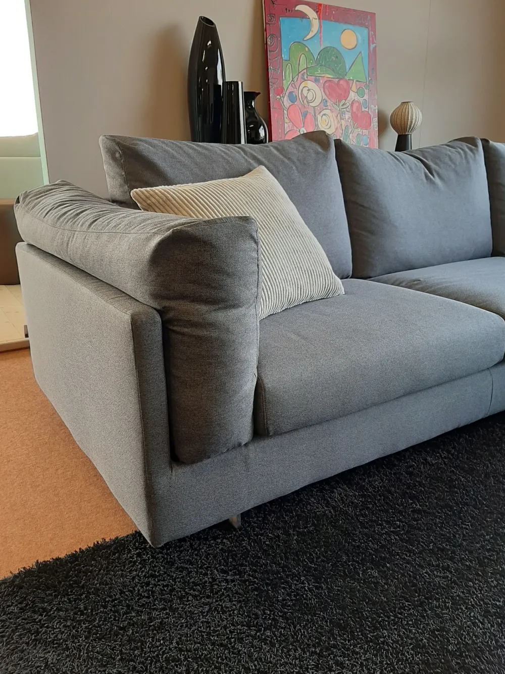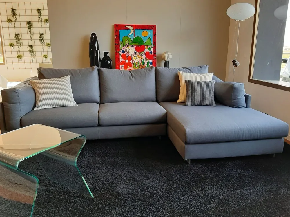 Divano mod. Zeno composto da terminale da 182 sx più chaise longue da 102×165 pr. dx rivestimento in tessuto in categoria A, art. 867/86 completo di 3 guanciali in misto piuma da 50×50, garanzia 10 anni sul prodotto.