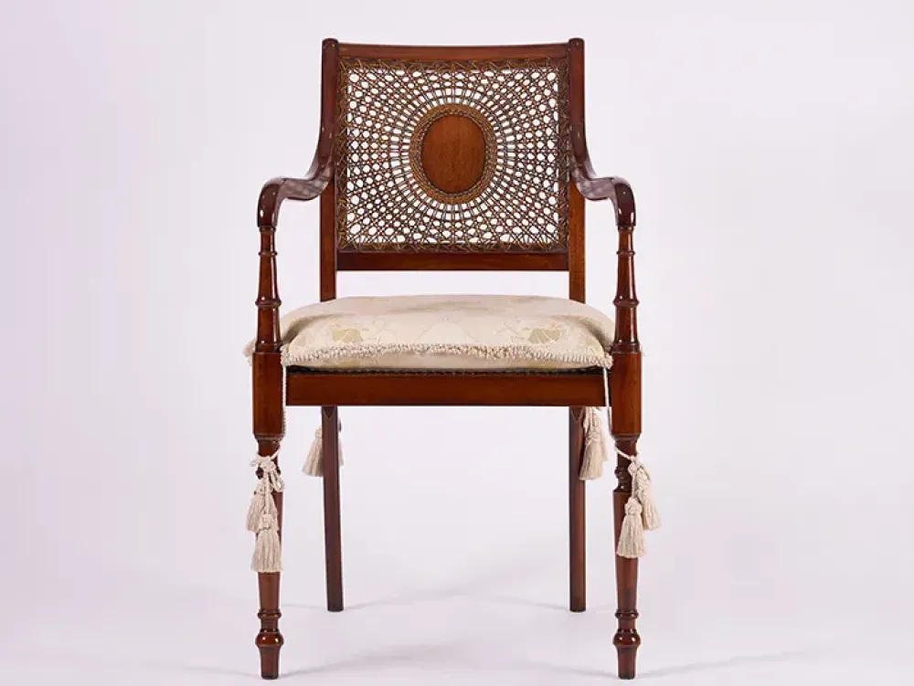 - 02 Poltroncina con struttura in piuma di noce ducale e schienale in paglia di Vienna intrecciata a mano con motivo raggio di sole – Dimensioni poltroncina: L 54 P 56 H 88 Hs 50