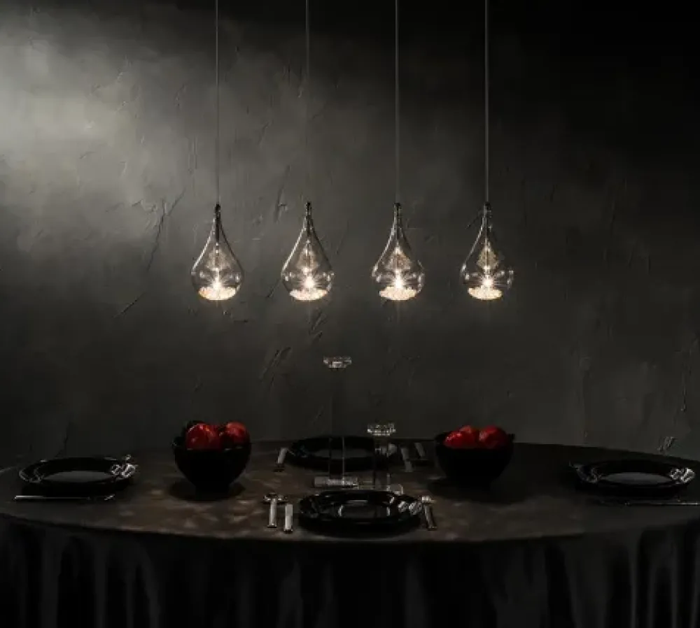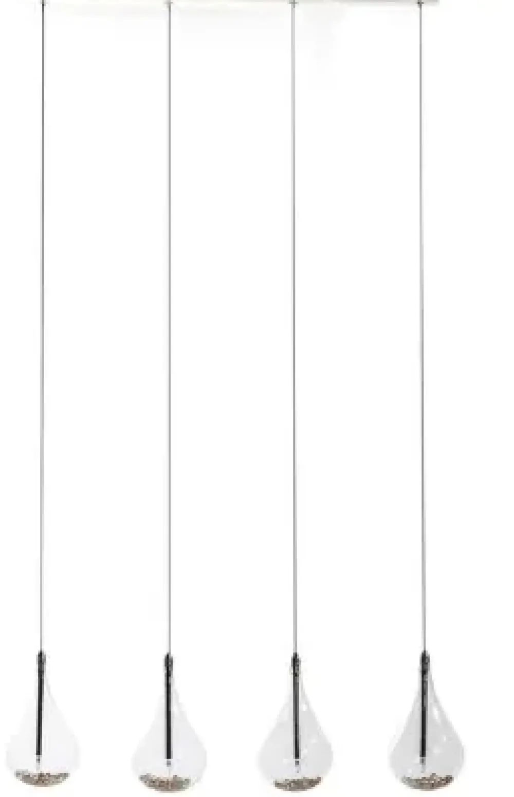 Realizzata in metallo cromato e vetro borosilicato chiaro Perle contiene all’interno di ognuno dei suoi 4 pendenti dei cristalli K9 che le conferiscono una brillantezza fuori dal comune e una raffinatezza senza eguali.