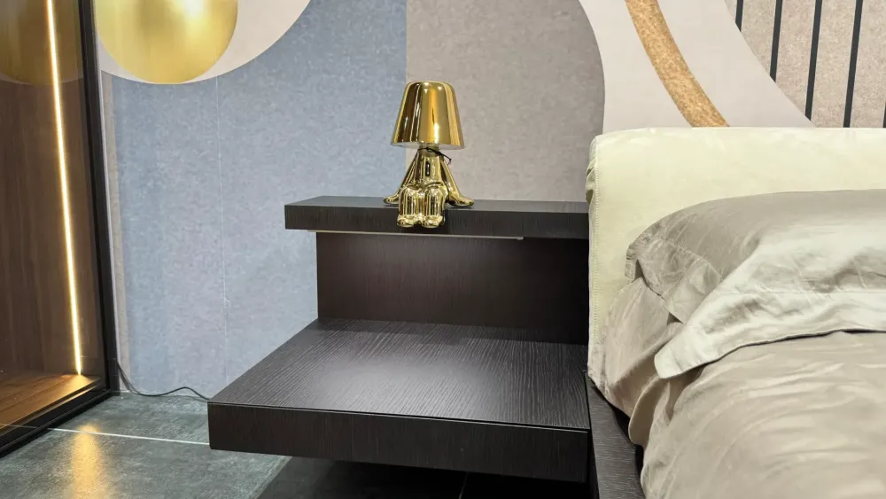 I cuscini della testiera sono reclinabili: in posizione eretta consentono una seduta piu comoda per chi ama leggere o guardare la tv a letto, mentre quando sono inclinati rendono la composizione visivamente piu armoniosa.