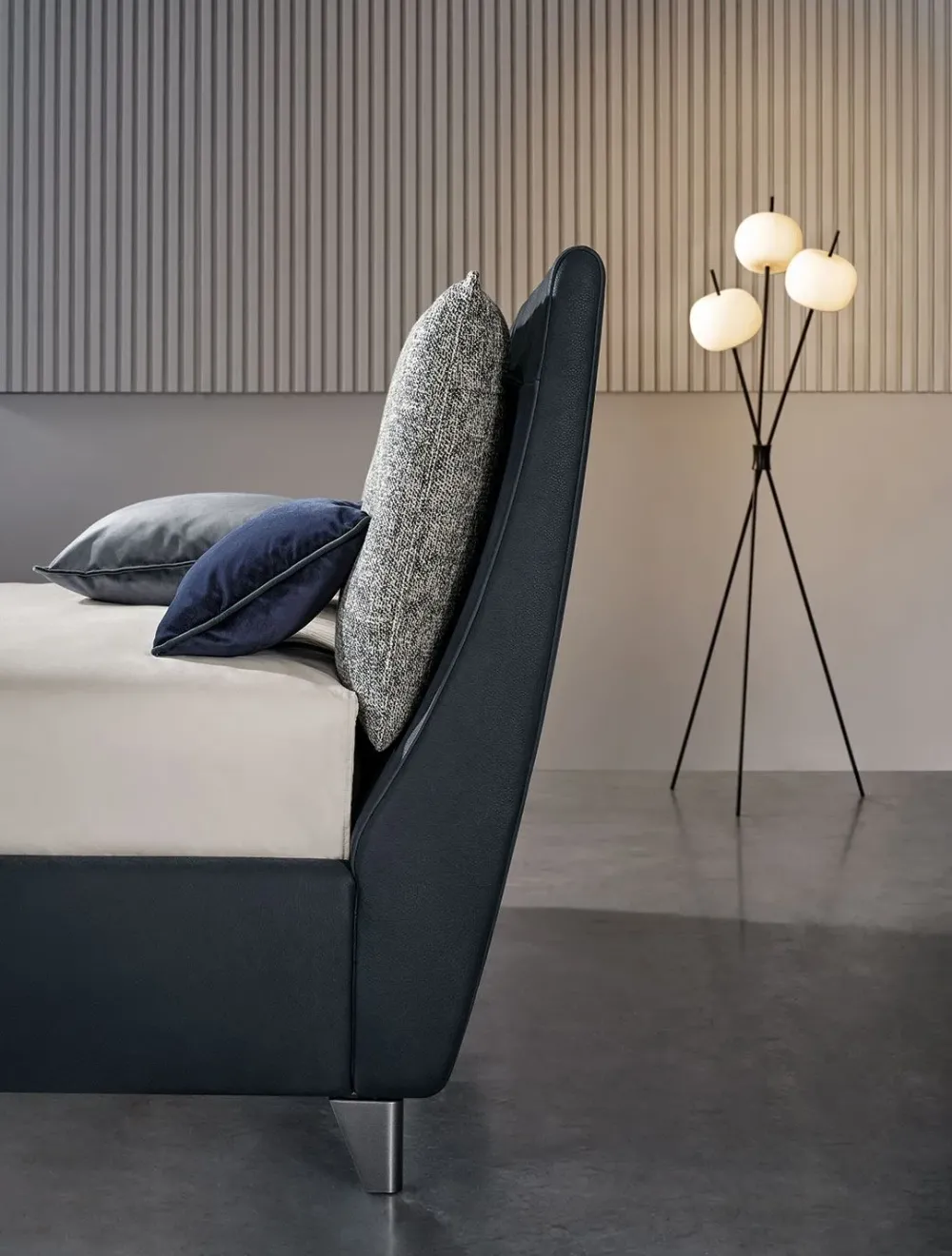Un letto contemporaneo che trova la propria identità nello schienale leggermente inclinato che si slancia dal giroletto verso l alto, in una curva elegante e in uno spessore sempre più sottile.