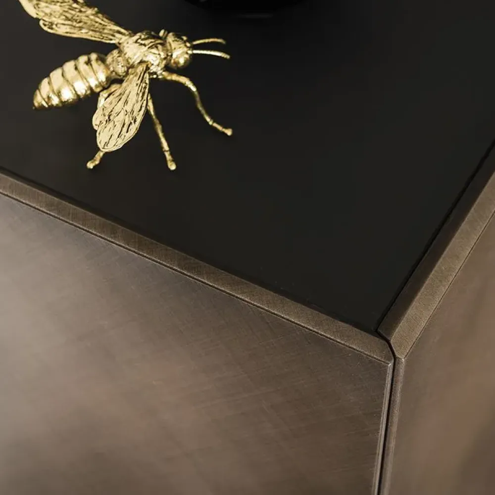 MADIA CATTELAN ITALIA MODELLO ARIZONA A4 Dimensioni cm 222×45,5x74h** Finitura: Madia contenitore in legno colore Brushed Bronze. Top in cristallo extrachiaro verniciato moka acidato. Piedi in acciaio verniciato goffrato nero (GFM73). Ripiani interni in legno color graphite. Dimensioni cm 222×45,5x74h