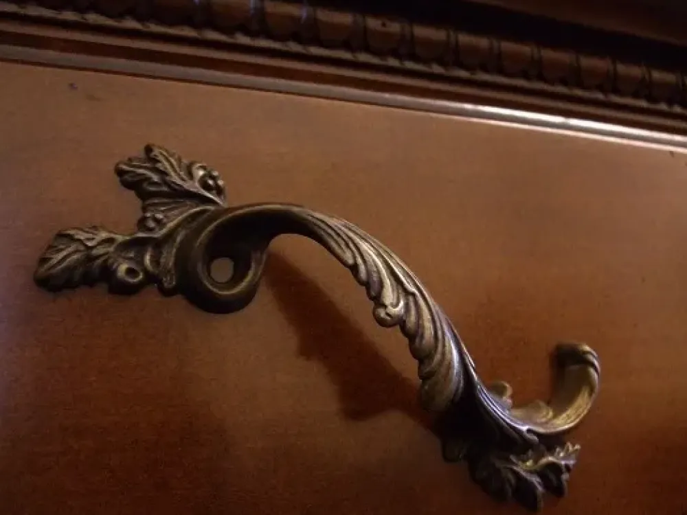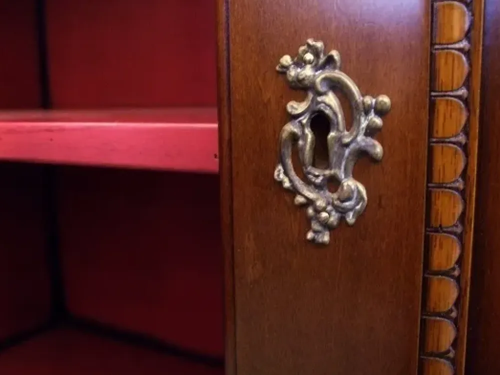 Dettagli stupendi: interno laccato rosso, serrature a chiave, maniglie in stile antiquariato.