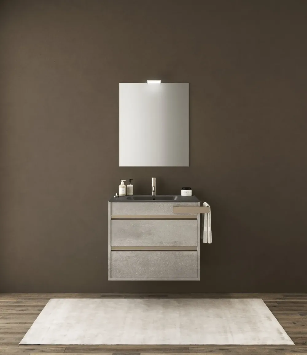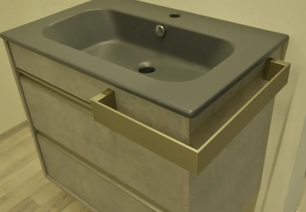 Mobile bagno da esposizione, collezione Smart46 Next 03 L.70 p.46 h.60 cm. in finitura Grafite Grey, a doppio cassetto e top con lavabo integrato in ceramica grigio opaco, apertura con presa a gola Kuk metallica colore Titanio, e con porta salviette metallico mod. Rock colore Titanio.