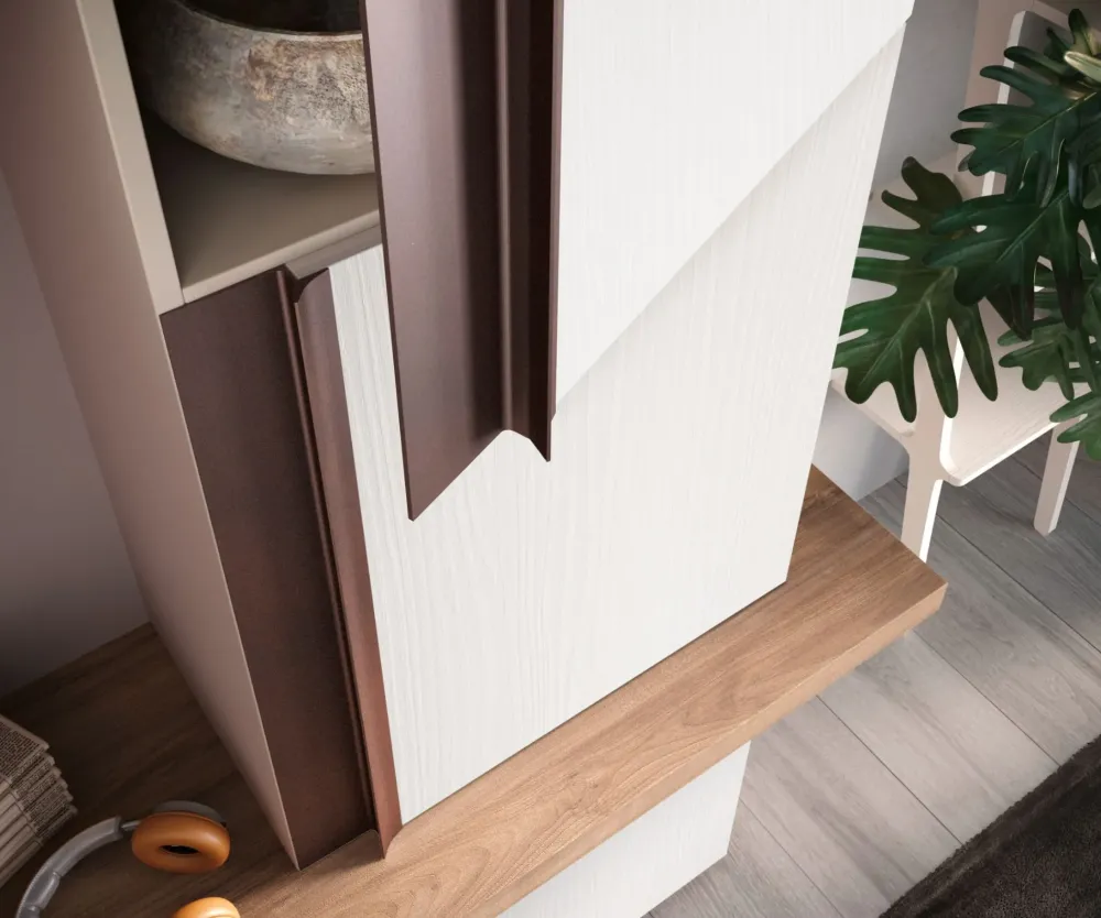 - Questa composizione per il soggiorno si rivelerà la soluzione ottimale se desideri una parete attrezzata con maniglia dalle forme decise.