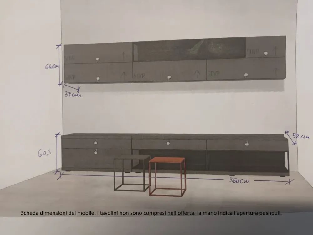 Pensili: lunghezza 360 cm; profondità 37 cm; altezza 64 cm (sono 6 moduli lunghi 120 cm e alti 32 cm)