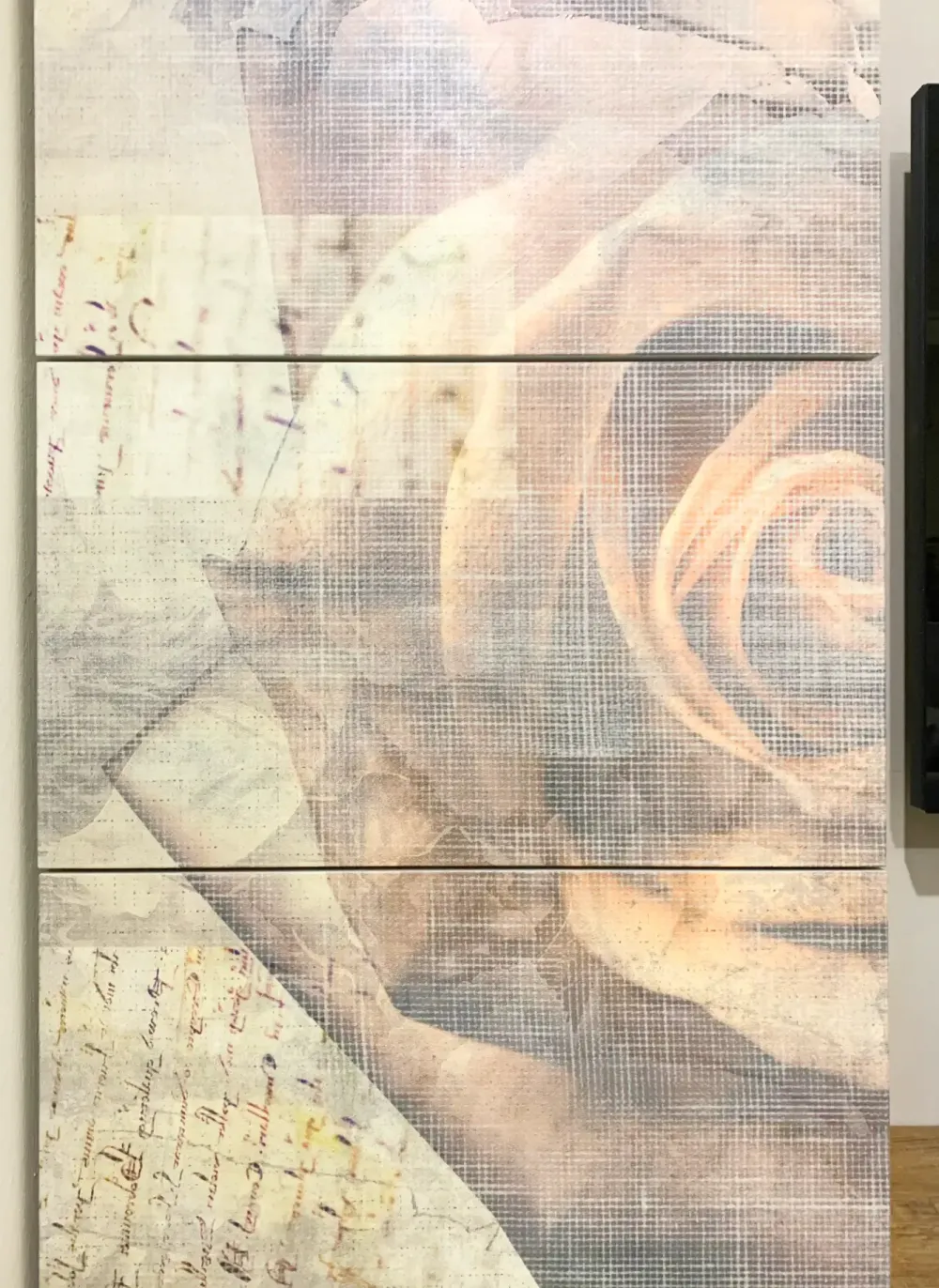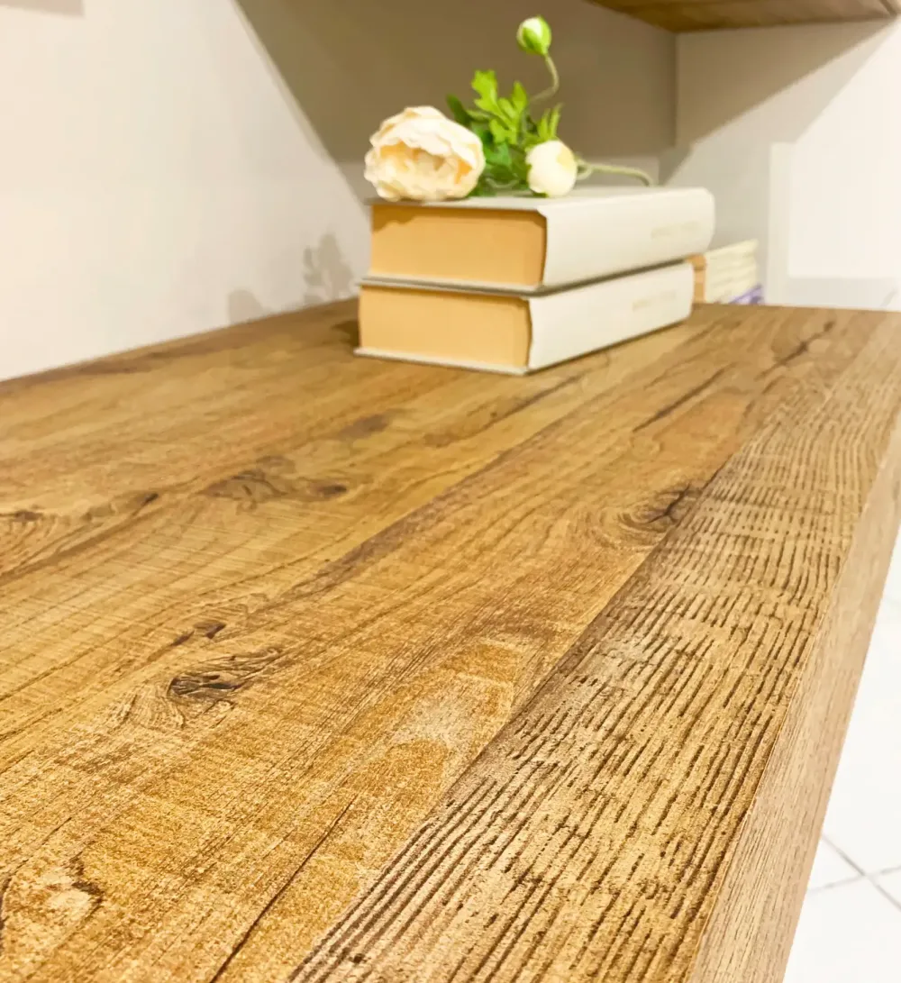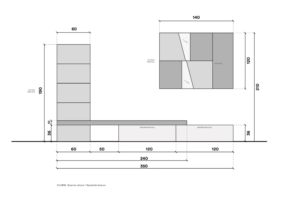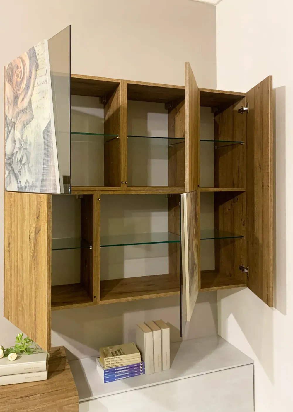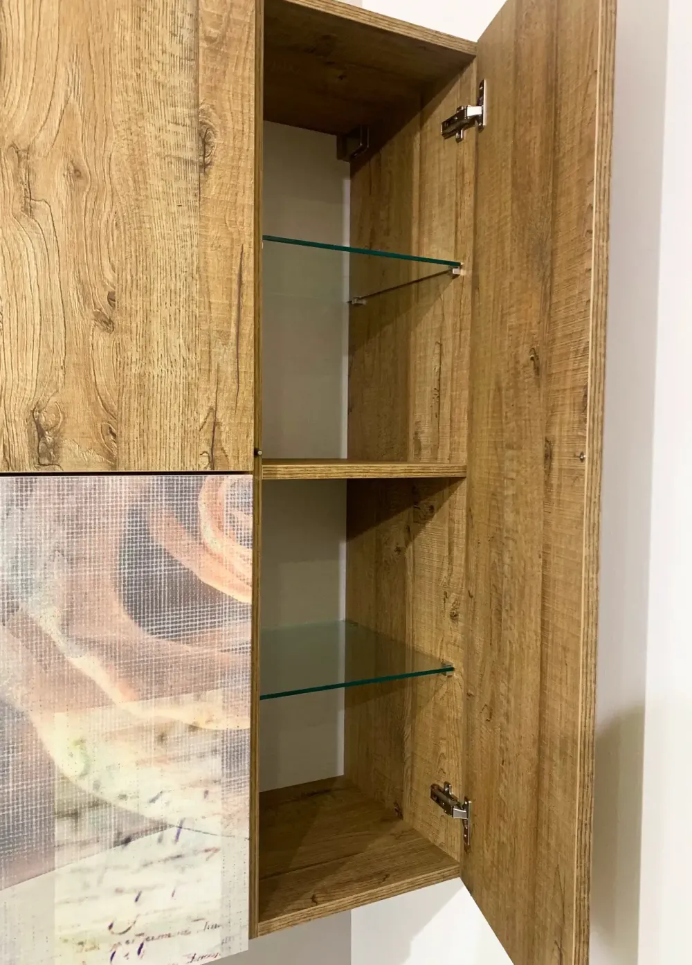 Finiture: quercia chiara, quercia chiara con decoro, spatolato bianco, dettaglio vetro fumé specchiato