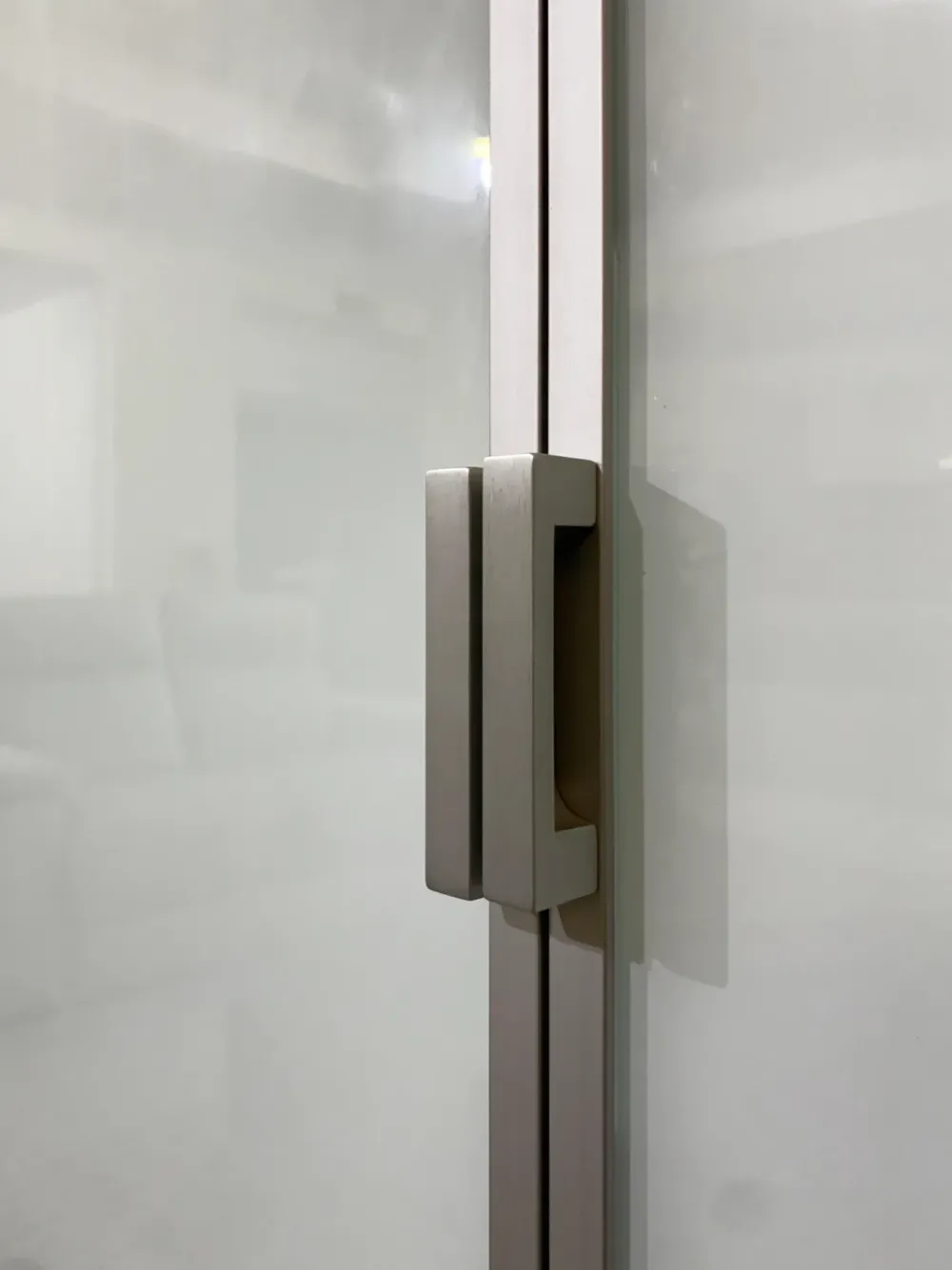 Parete libreria a spalla Tisettanta in finitura legno Wengé, ante battenti in vetro satinato lucido con maniglia integrata in telaio cromato satinato.