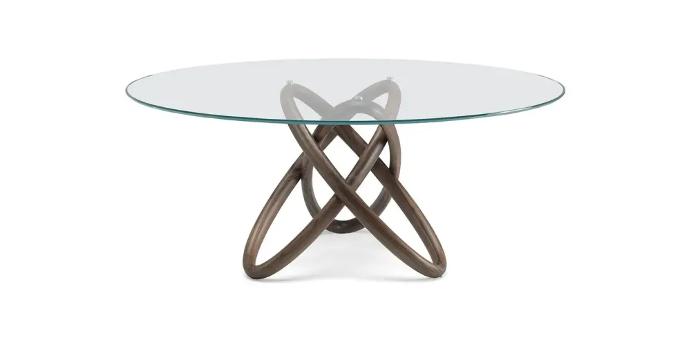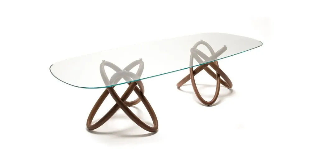 Tavolo con base in massello di noce Canaletto (NC). Piano con piastre in cristallo 15mm trasparente o trasparente extrachiaro con bordo bisellato.