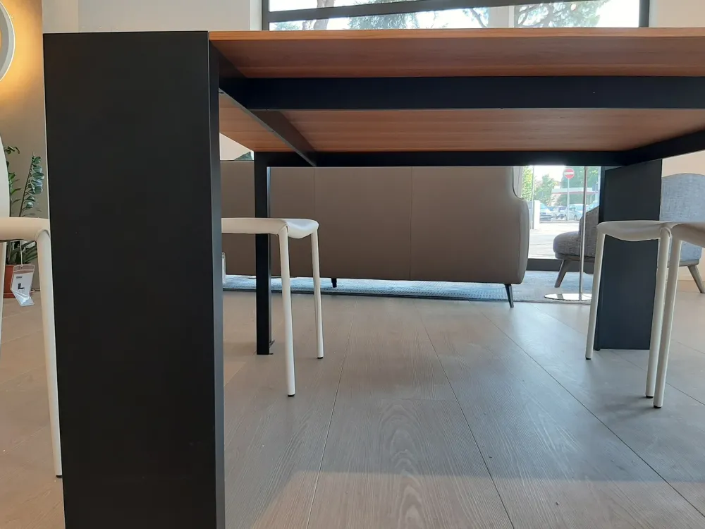 Il tavolo “Metallico” di PORRO si caratterizza per la leggerezza di piano in alluminio massiccio rivestito in noce canaletto e gambe realizzate in lamiera d’alluminio nero con spessore 12 mm. L’alluminio massiccio conferisce a questo oggetto solidità e leggerezza, oltre ad essere ecologico. La particolare finitura superficiale, vellutata al tatto ed esteticamente pregiata, viene ottenuta tramite una verniciatura catalizzata ad alto spessore e alle successive fasi di levigatura e ceratura a mano, che ne conferiscono l’effetto materico. Adatto sia per le sale da pranzo che per zone riunione. VERA OCCASIONE per gli amanti del design italiano Dimensioni cm 148 x 148