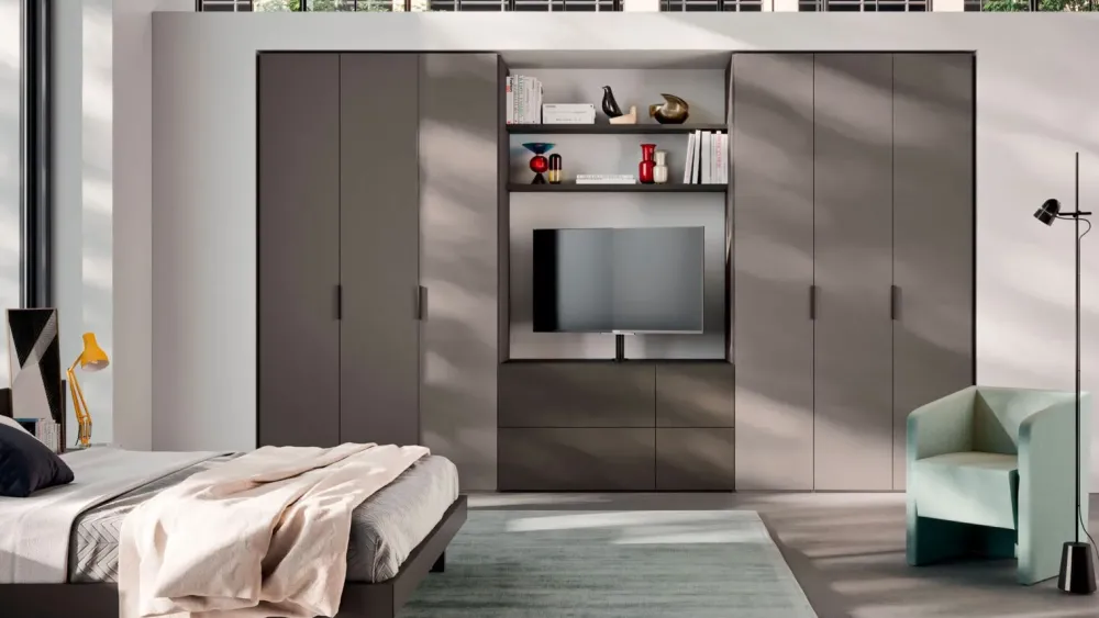 Le sei ante custodiscono ampi spazi interni pensati per organizzare al meglio abiti, biancheria e accessori, mentre la zona centrale ospita un vano TV con mensole a giorno ideali per libri, oggetti personali o elementi decorativi.