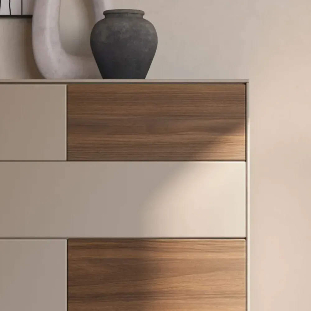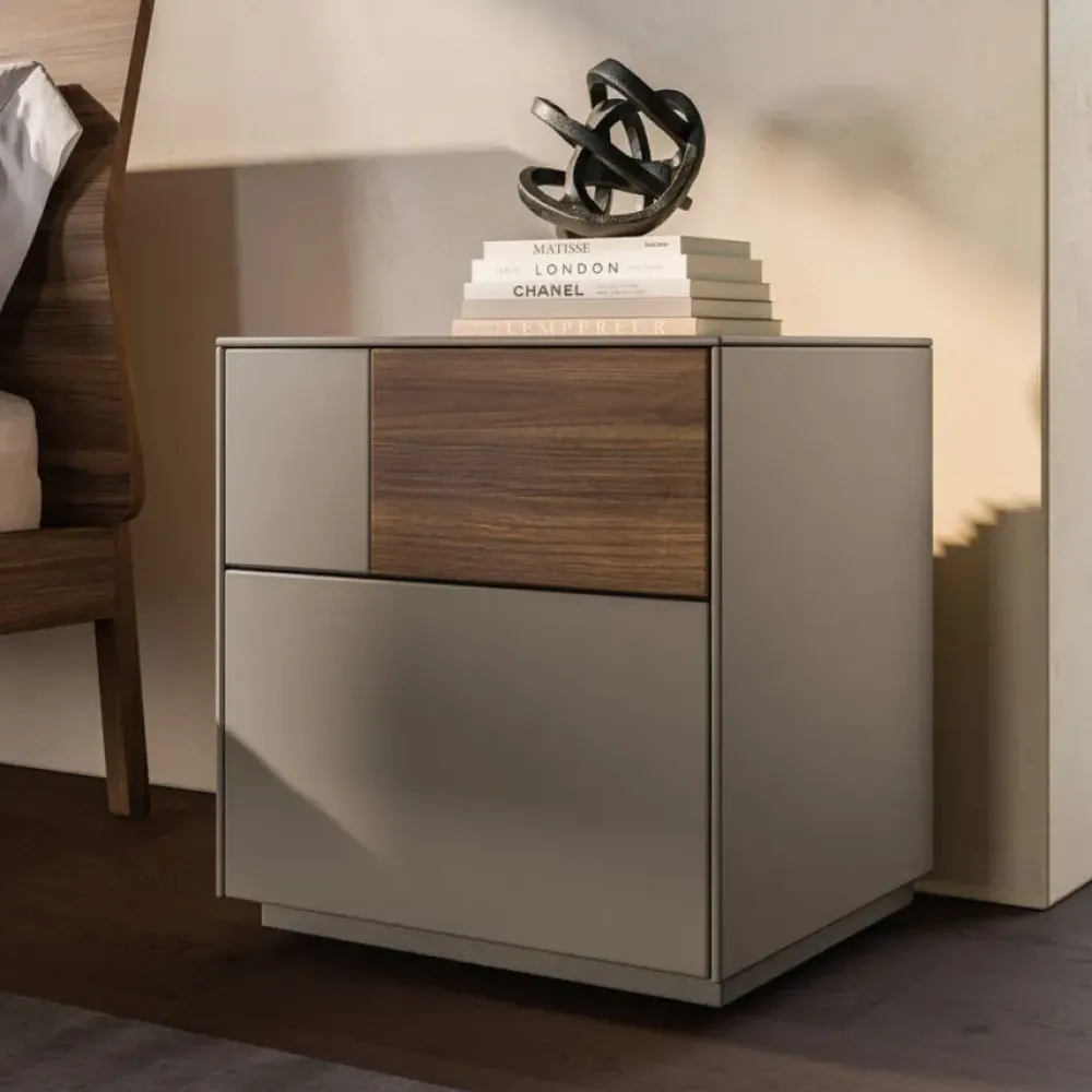 Elementi: Comodini e como Klee in melaminico Tortora con dettagli in materico Cotto.