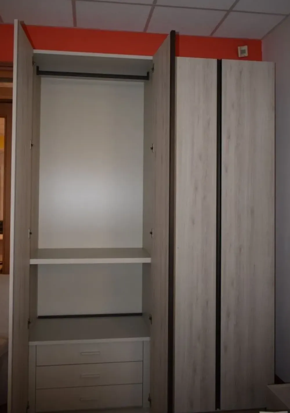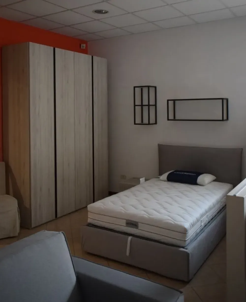 Cameretta singola in Esposizione presso il nostro punto vendita. Composizione comprendente letto ad una piazza e mezza con contenitore, armadio a 4 ante battenti di lunghezza 180cm e altezza 258cm in finitura rovere cenere, comodino a due cassetti con aperture a gola e pensili factory in metallo. La composizione è offerta a 2.500,00, consegna nazionale compresa nel prezzo.