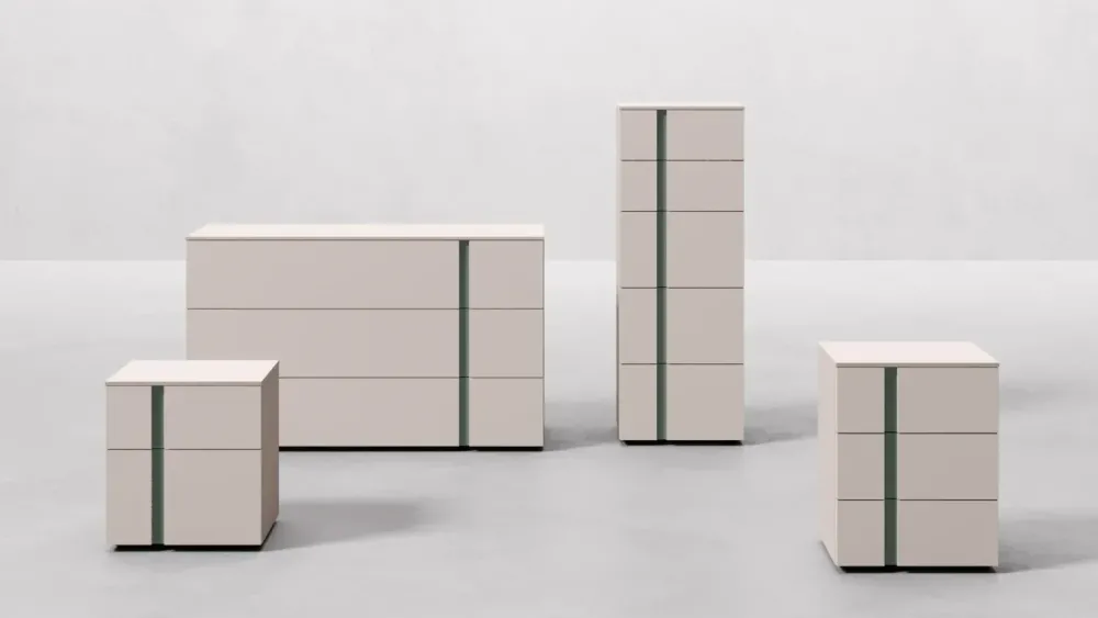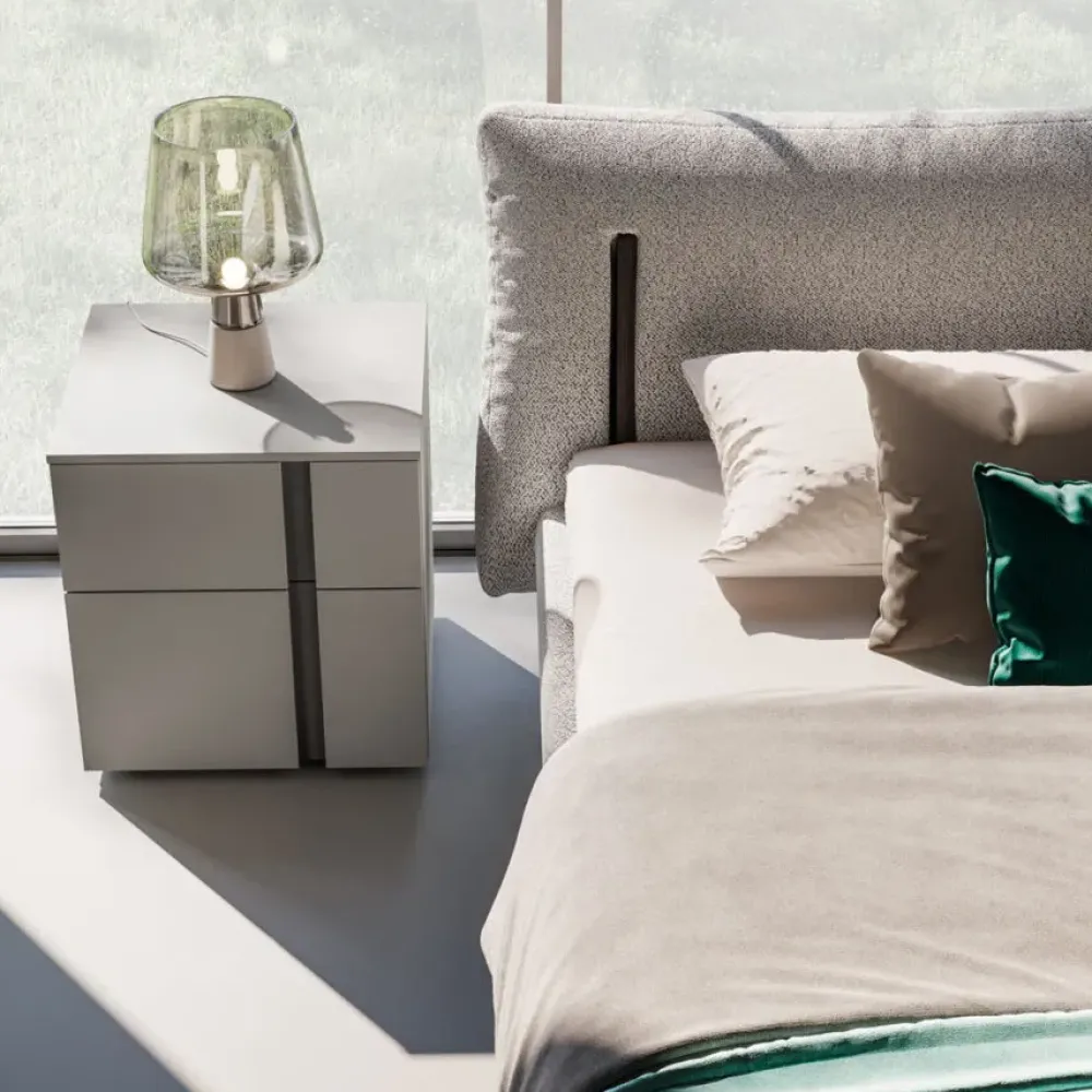 Gruppo Aries – dettaglio 02:Comodini e comò Aries in laccato opaco Titanio con particolare maniglia in laccato opaco Tufo.