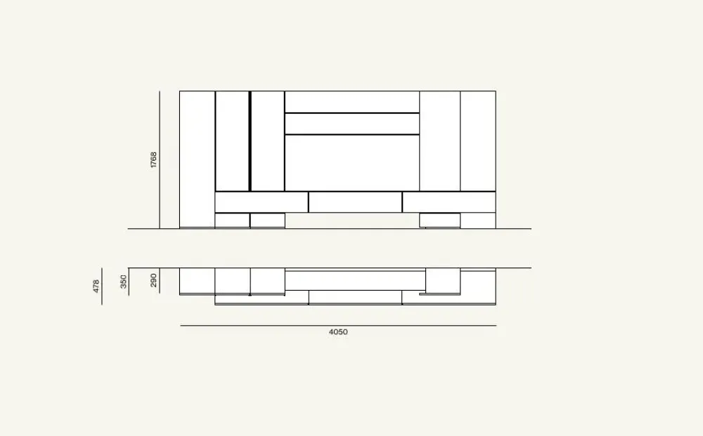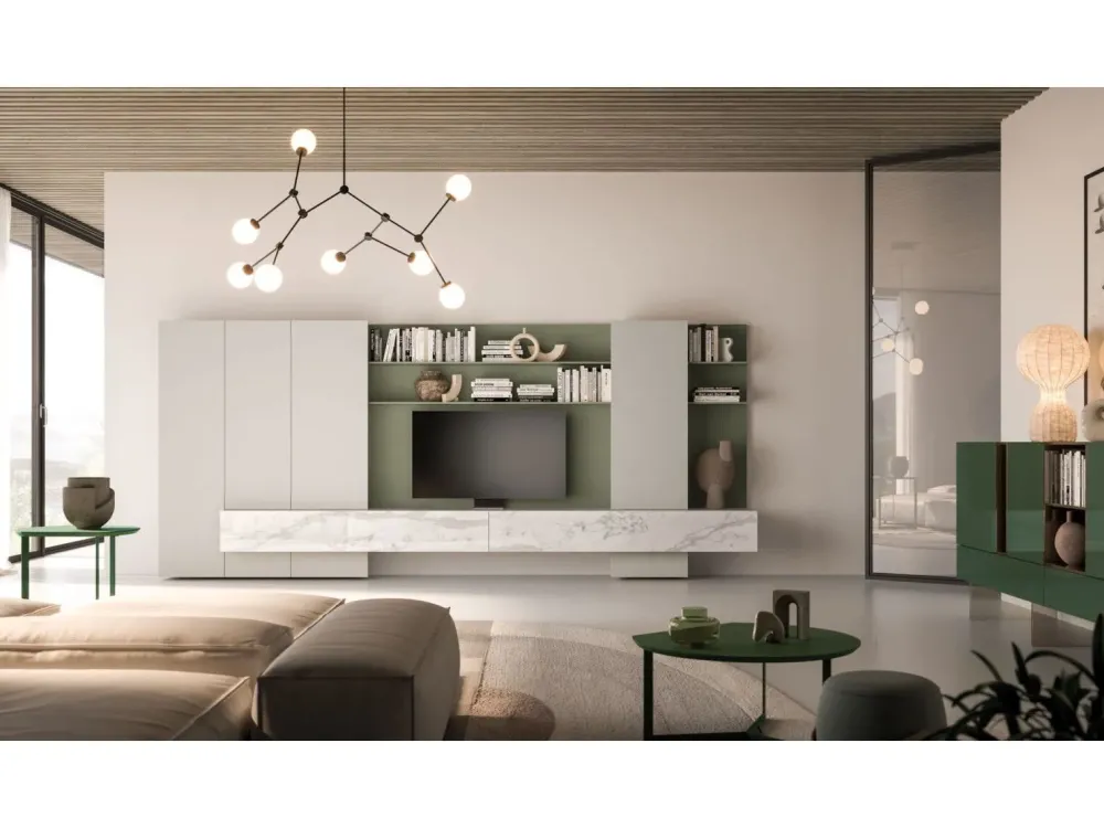 Esempio di soggiorno Day 7 al prezzo esposto come in foto, pensili in materico Seta, cassetti con frontale vetro serigrafato Calacatta Gold, Misura L.4500 H.1768 P.350/478.