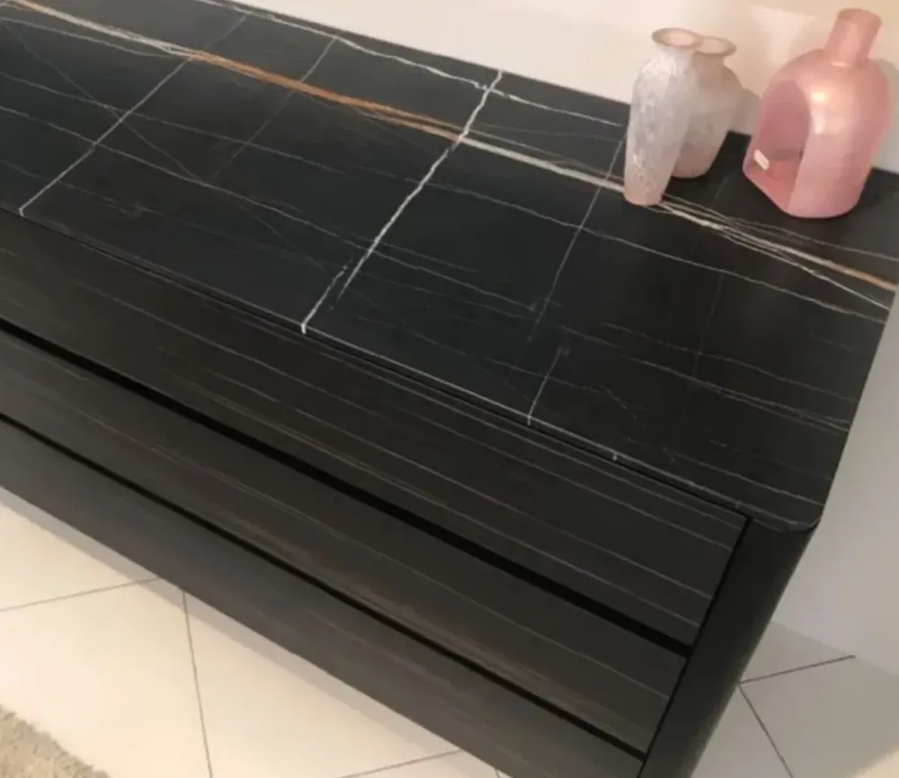 – 01 comò mod. Marie con gola e piede. Finitura struttura ebano scuro, piano in marmo sahara nero. Dimensioni: L 125 P 54 H 81