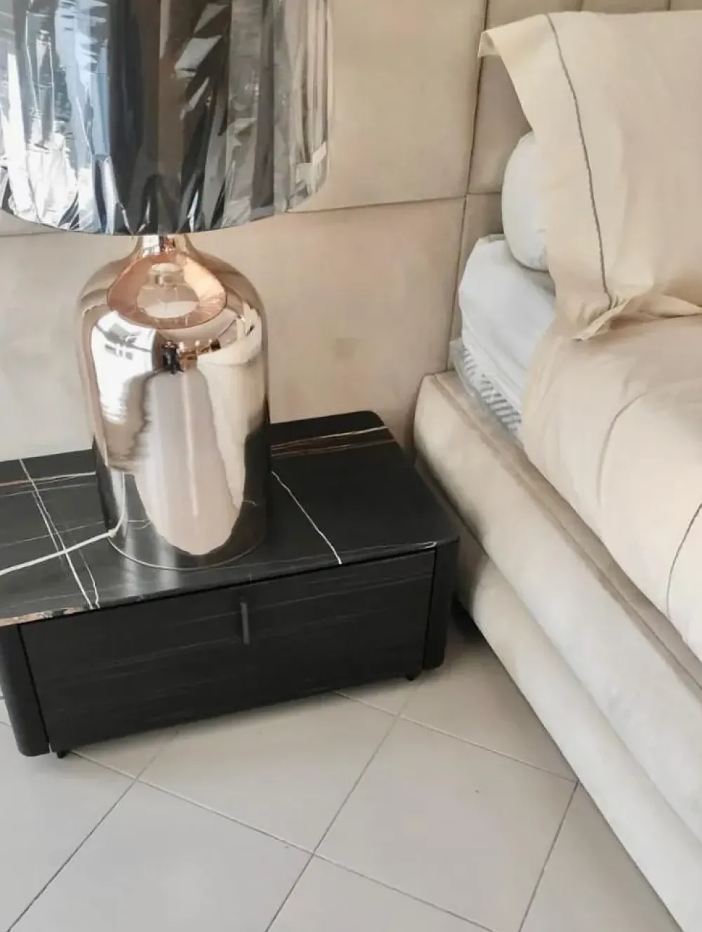 – 01 comodino Maxi mod. Nuage con maniglia verticale fin. ottone brunito. Finitura struttura ebano scuro, piano in marmo sahara nero. Dimensioni: L 70 P 40 H 33