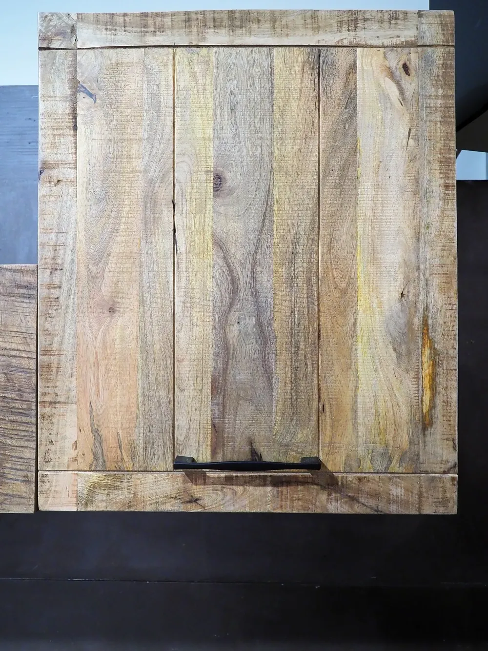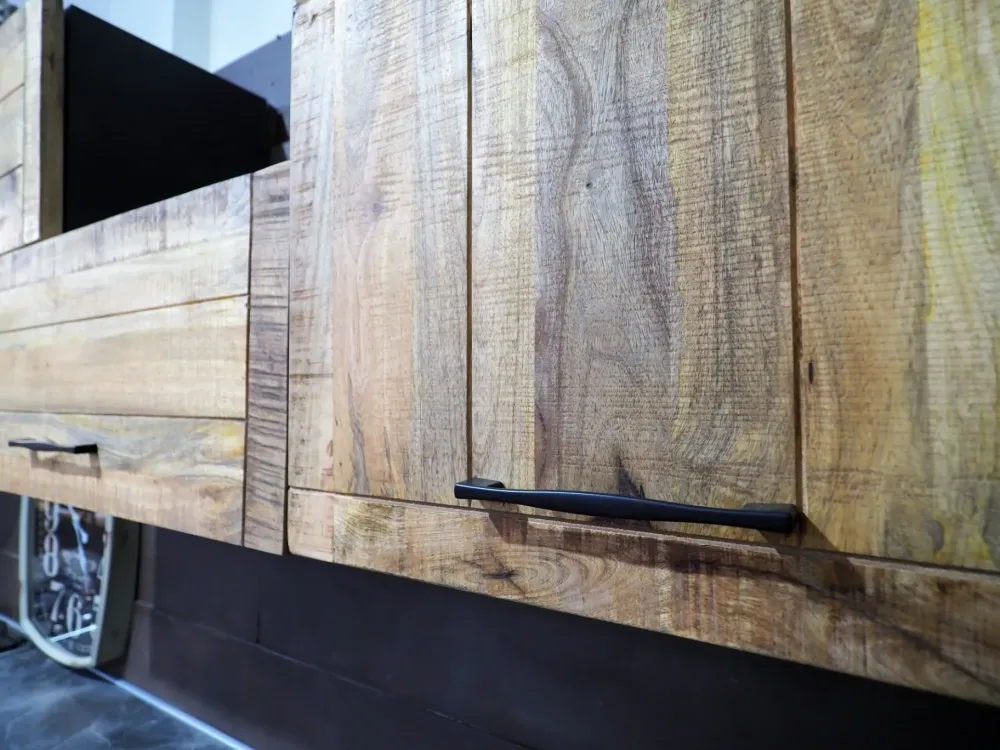 cucina modello offerta lineare industrial vintage con ante in vero legno massello newport seesham wood noce indiano chiaro uniche nel loro genere anche le maniglie sono in ferro indiano poi la struttura ha nella parte superiore sopra le ante un gioco di guida di metallo che rende la cucina cosi anche in stile veramente industriale old factory