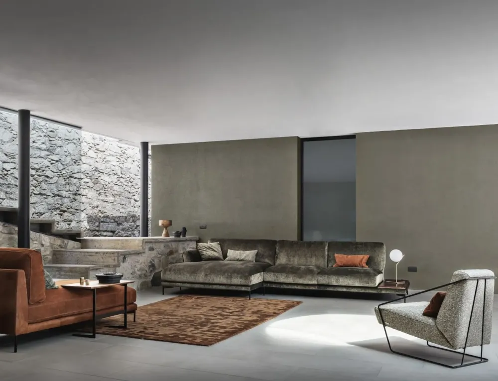 Sedute e schienali imponenti e braccioli dall effetto morbido e scomposto sono abbracciati da una struttura geometrica e lineare, conferendo al Cadorna una sensazione di avvolgente relax.