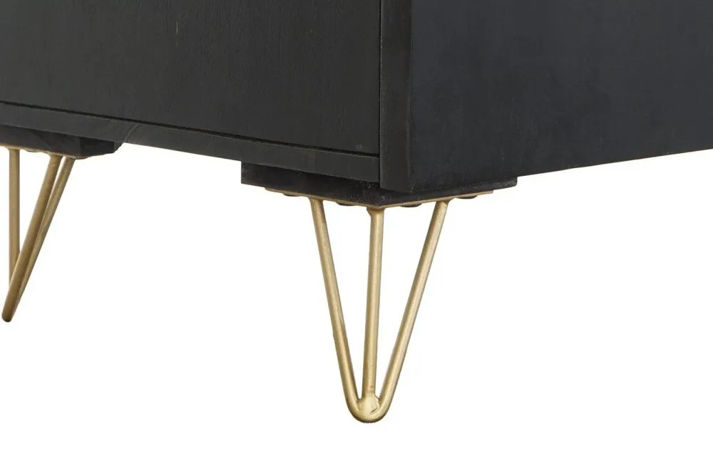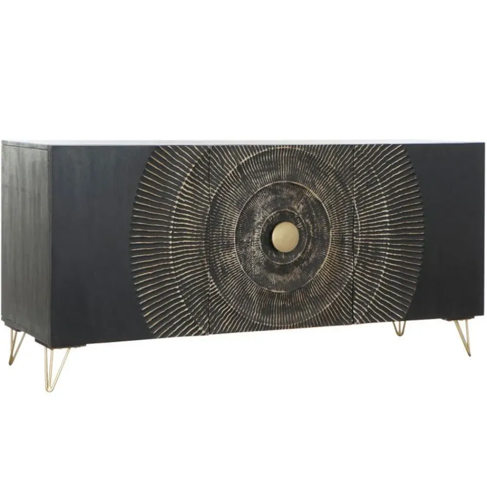 Credenza Mango Nera 160, credenza costruita artigianalmente in legno massello di mango, colore nero con inserti in metallo nel frontale delle ante in colore oro. Composta da 3 ante con mensola interna.