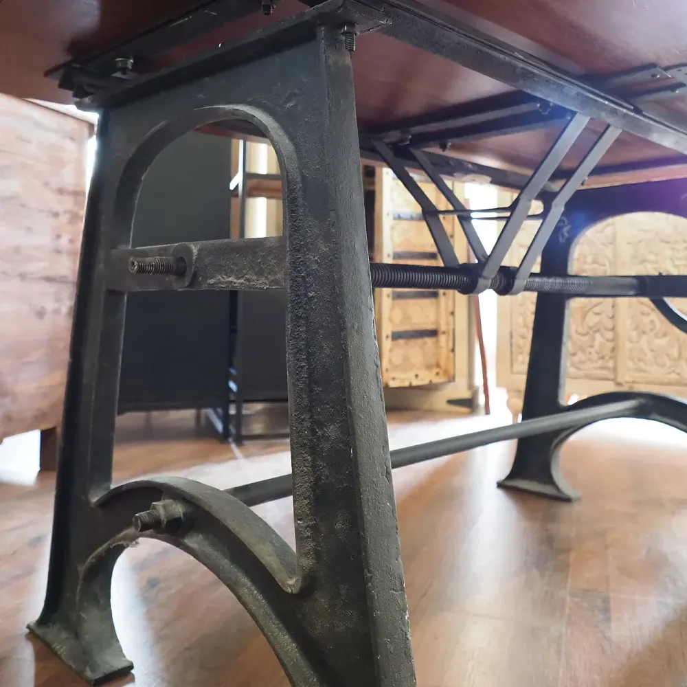 bellissimo ed unico tavolo industrial con basamento in ferro pesante con meccanismo a manovella allungabilequesto particolare tavoloin legno vero legno colore noce tulipie con prolunga centrale e meccanismo a manovella che fa allargare le due parti del tavolo per inserimnato al centro della prolunga molto bello anche il meccanismo ancopra artigianale dellla manovella che ricord ai tavolo del fine ottocento