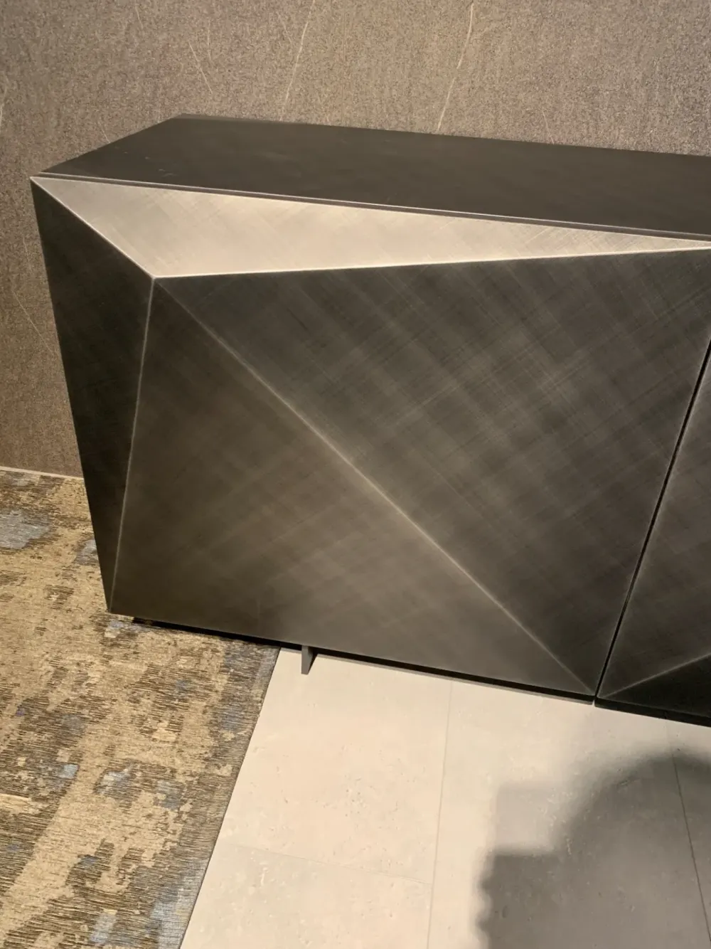 Kayak è una madia dal design eclettico e scultoreo pensata per arredare con eleganza ambienti residenziali e per completare raffinati progetti di contract interior design come lussuosi ristoranti di design. Che si tratti di zona pranzo o di ambienti living, questa credenza moderna dall anima poliedrica, mostra pregiati dettagli ed esclusive finiture. La finitura Brushed Grey regala caleidoscopici giochi di luce . Il suo cuore è fatto di setosi ripiani in cristallo trasparente, perfetti per riporre gli oggetti più cari.