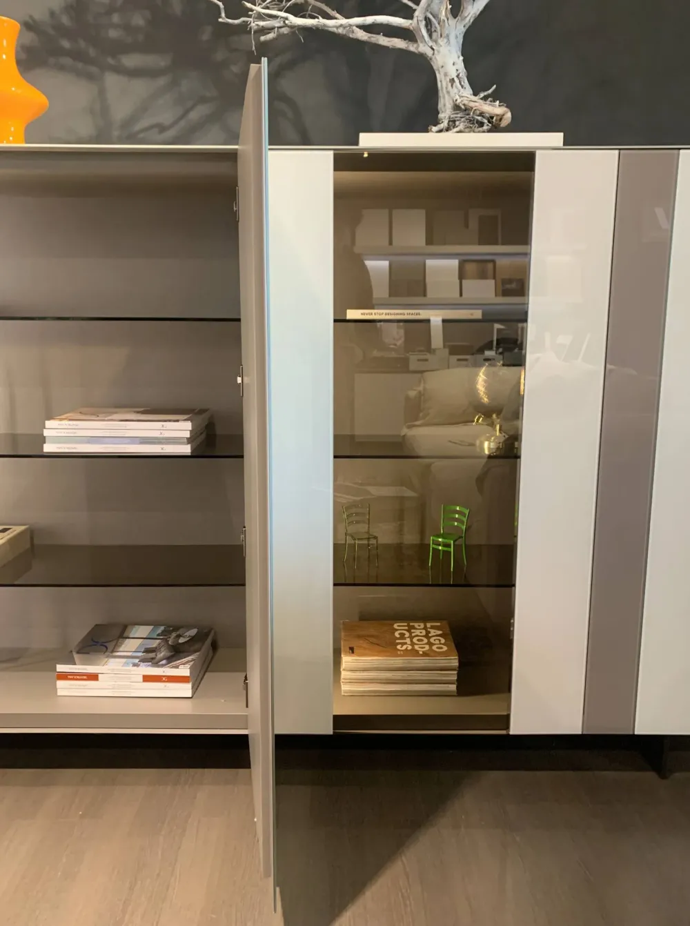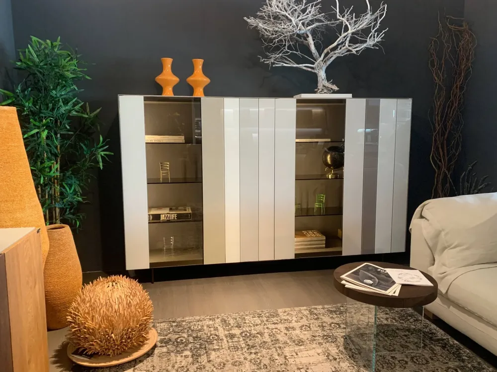 Now è un mobile contenitore con vetrine che da solo è in grado di arredare ed arricchire una parete. Le ante in vetro senza maniglie e le fasce di diversi colori sono i suoi punti di forza.