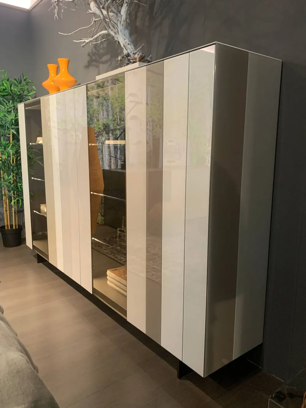 Struttura in melaminico pomice. Ante, fianchi e top in vetro lucido colori Cocco, Spago, Bianco, Mandola, Fango, Iuta. 2 Vetrine in vetro fumè bronzo con LED interni. Ripiani in vetro fumè bronzo e schienali in melaminico Lino. Piedi in metallo finitura Peltro Steel. DIMENSIONI: cm 230,8 x 40,6 x 142,8