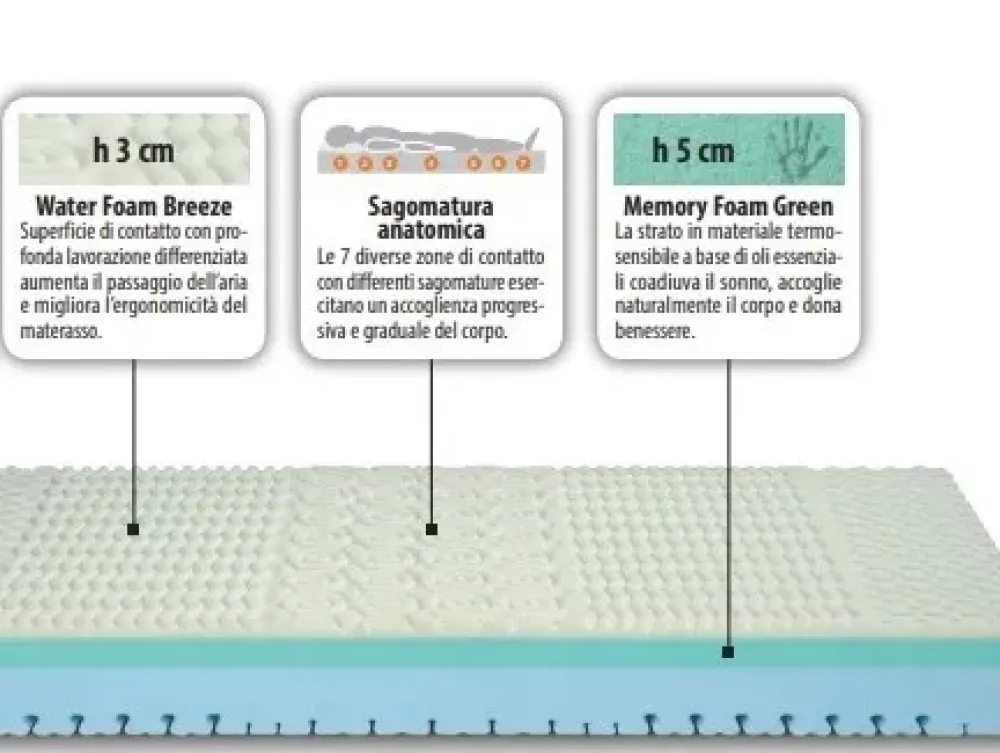 Memory Foam a cellula aperta, offre un alto livello di traspirabilità ed è capace di assorbire il calore in eccesso del corpo, creando un perfetto microclima sano e igienico soprattutto per chi soffre di una forte sudorazione. Pratico e igienico garantisce un riposo migliore e più sano.