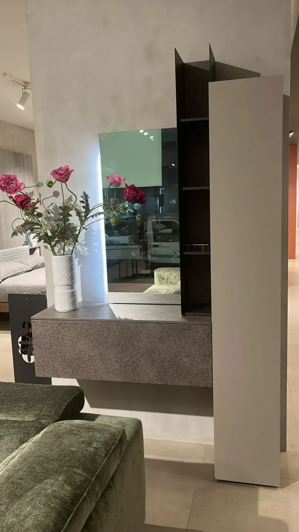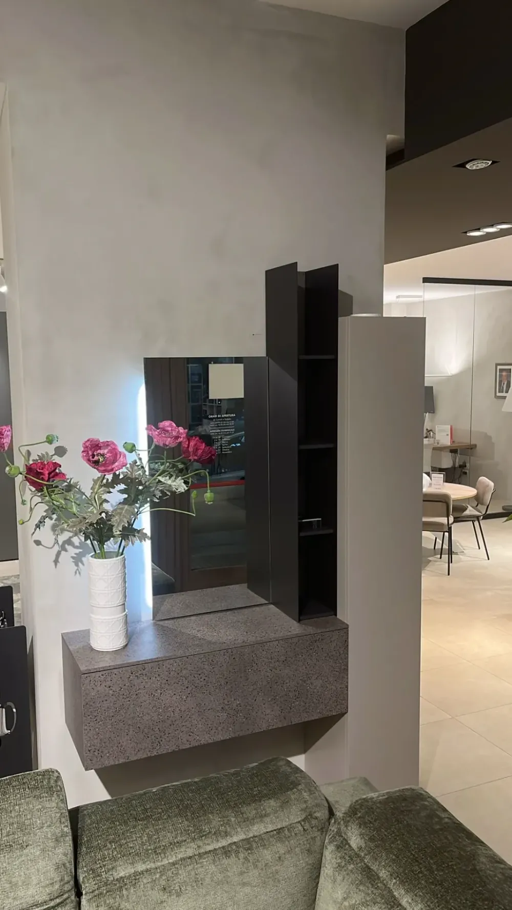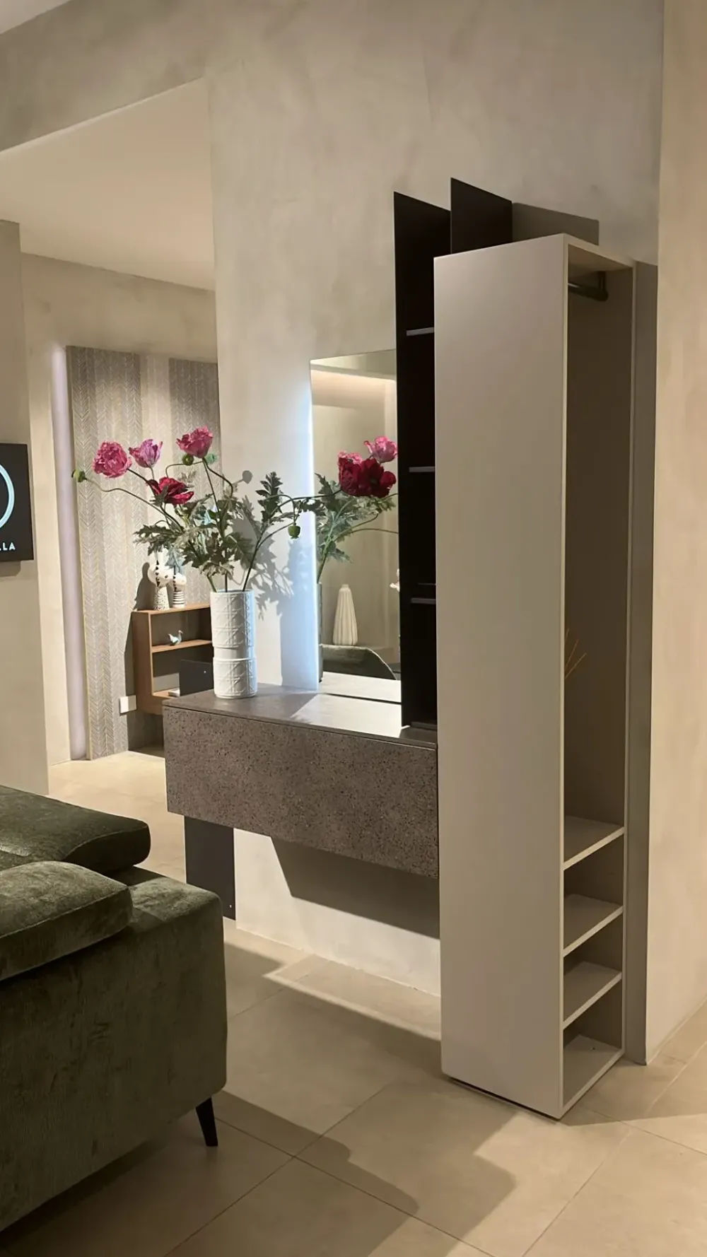 Ingresso Tomasella composto da N 1 Libreria verticale finitura antracite e graniglia, N 1 Pannello specchio con Strip led L.1080, N 1 Colonna H 127 in finitura hot e piombo, N 1 Base sospesa con cestone in finitura graniglia e termocotto