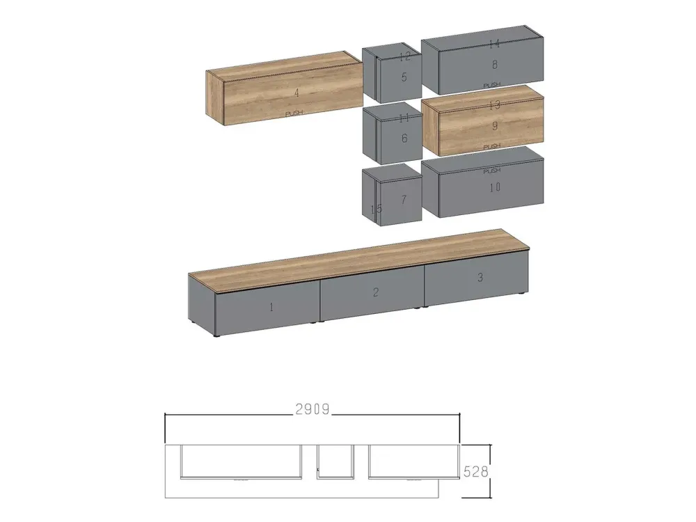 Questa parete attrezzata si compone di una base a terra su piedini (L. 270 x P. 53 x H. 36 cm) composta da tre cestoni con maniglia nera integrata colore grigio con soprastante top in rovere chiaro.