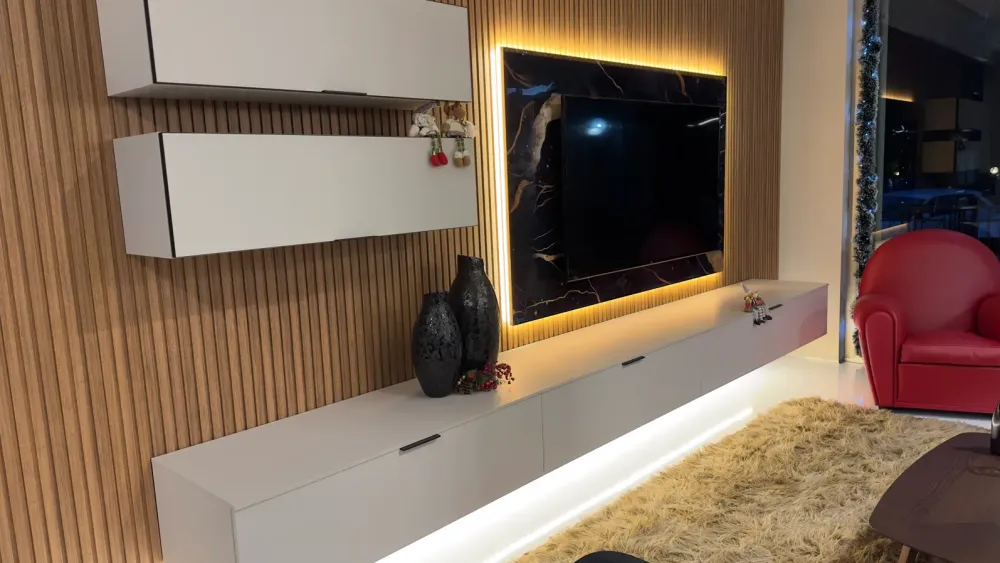Parete attrezzata Zalf con pannellatura dogata in MDF ed elemento porta tv effetto marmo retroilluminato.