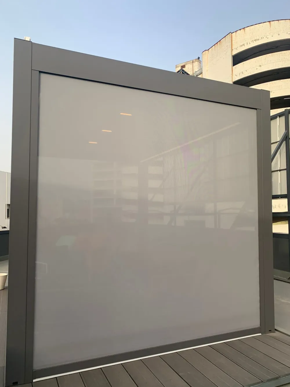 La Pergotenda®️ Maestro è realizzata con struttura in alluminio e telo in PVC spalmato Antitrasparente, scorrevole ad impacchettamento dotato di tubi calandrati, per un aspetto curvo di grande dinamismo e particolarmente efficace nella gestione dell’acqua piovana che dal telo arriva nelle gronde per poi finire nei piantoni dove avviene lo scarico a terra. Maestro è il modello in cui la pulizia dei dettagli è estrema, non c’è alcuna vite a vista e le gronde sono perfettamente integrate nelle travi. L’alluminio è un materiale al contempo leggero e resistente ai carichi, che offre l’ulteriore vantaggio di non avere necessità di particolare manutenzione. I due kit luci presenti garantiscono un’eccellente illuminazione sia con telo disteso che impacchettato mentre le tende scorrevoli laterali offrono riparo dal vento e dai raggi solari (il posizionamento delle due tende può essere invertito. In alto ad un piantone troviamo un utilissimo anemometro che misura costantemente la velocità del vento, azionando un sistema di sicurezza che impacchetta il telo superiore e gli scorrevoli in caso di vento forte così da evitare problematiche alla struttura. L’intera struttura ed i suoi accessori sono governabili dal radiocomando a 10 canali semplicissimo da utilizzare.