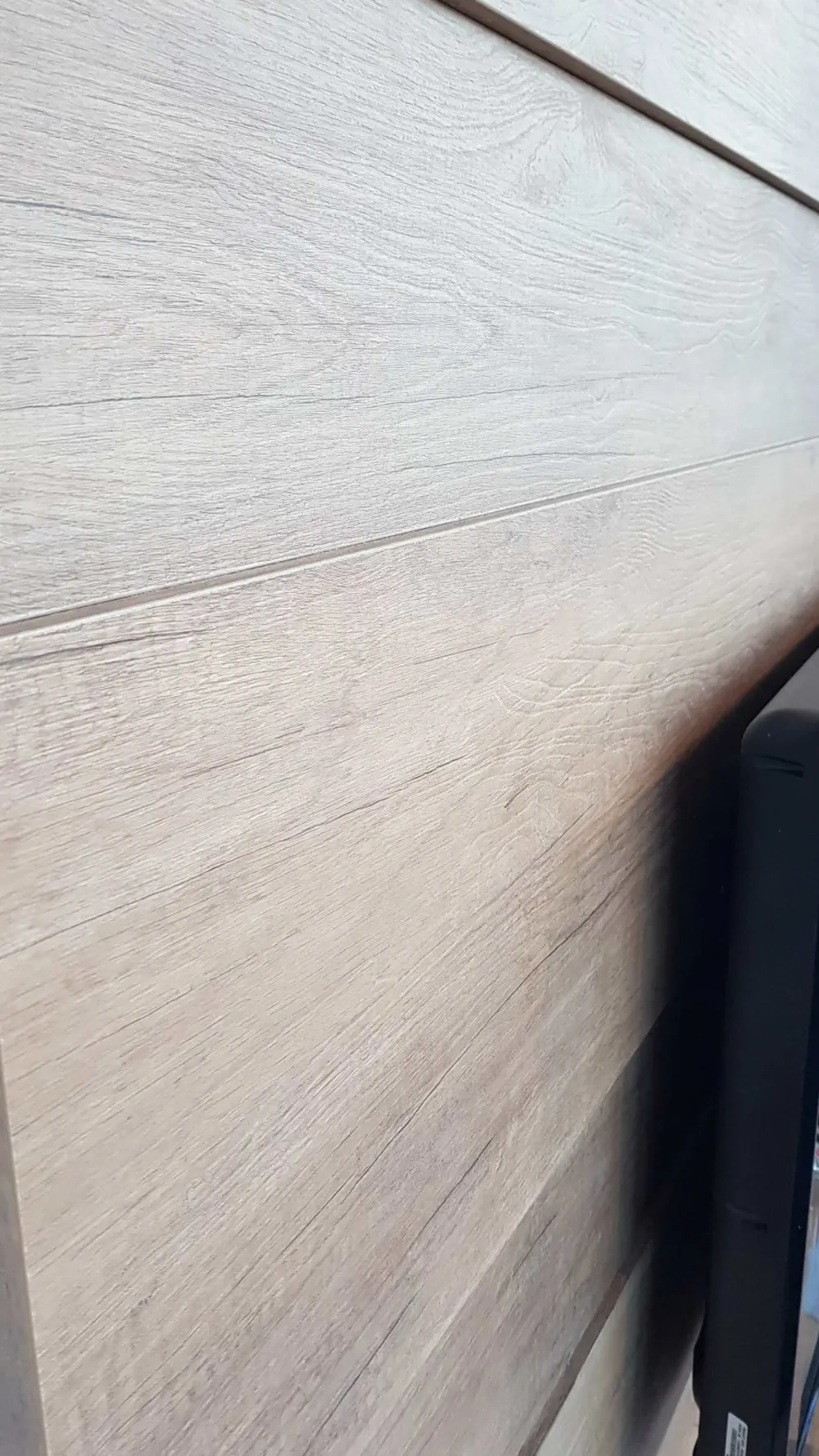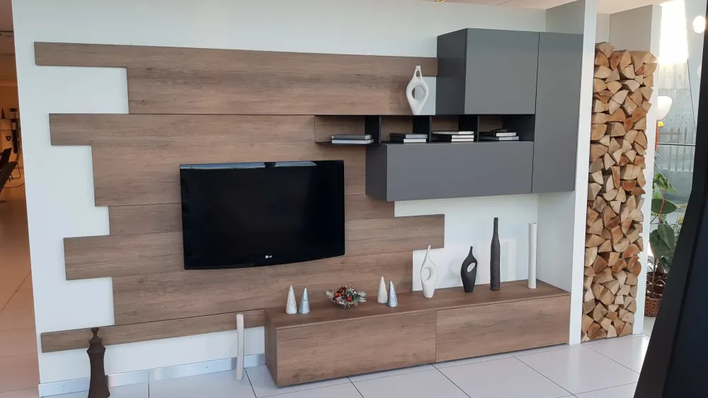 La pannellatura sempre in finitura rovere nodato chiaro che fa da sfondo e sorregge il televisore è caratterizzata da doghe di vario spessore per creare movimento e dare maggiore valore alla parete, inoltre prevede un’intercapedine per il passaggio dei cavi rendendoli invisibili