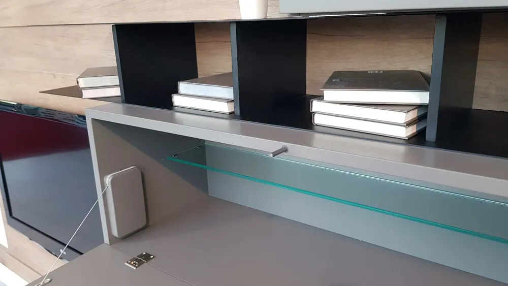 Le basi in finitura rovere nodato chiaro sono caratterizzate da un elemento con anta a ribalta predisposto per alloggiare gli apparecchi tv e da un elemento con cassettone montato su guide ad estrazione totale per sfruttarne appieno la capienza.