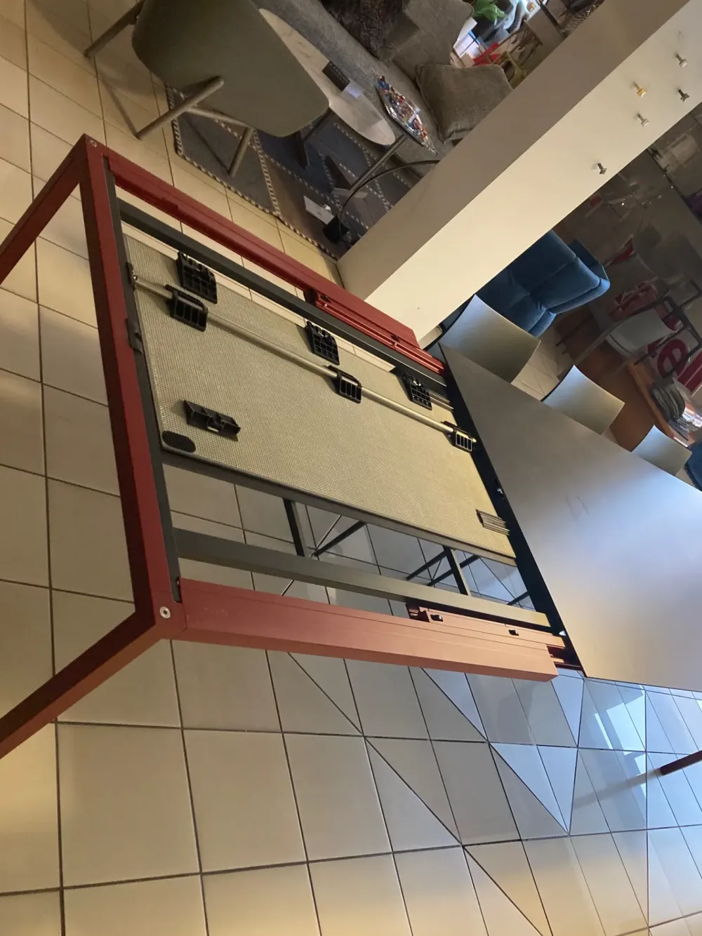 Tavolo allungabile con gambe in acciaio sezione 35×35 mm e giunti in pressofusione e telaio in estruso di alluminio. Struttura nelle finiture laccato opaco rosso lampone. Piano e prolunghe con apertura a libro in ceramica colore asfalto