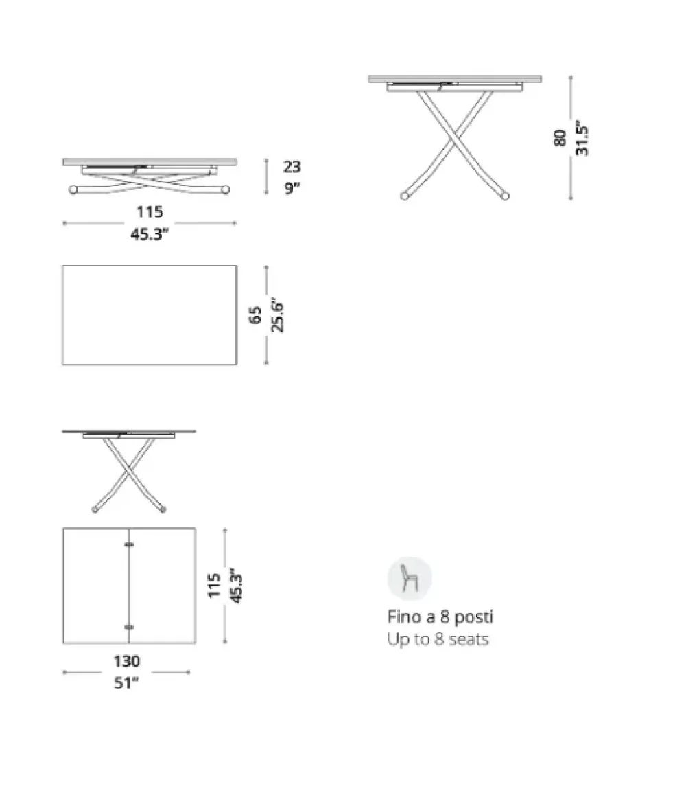 Tavolino trasformabile con base in metallo e alzata con pistone a gas.