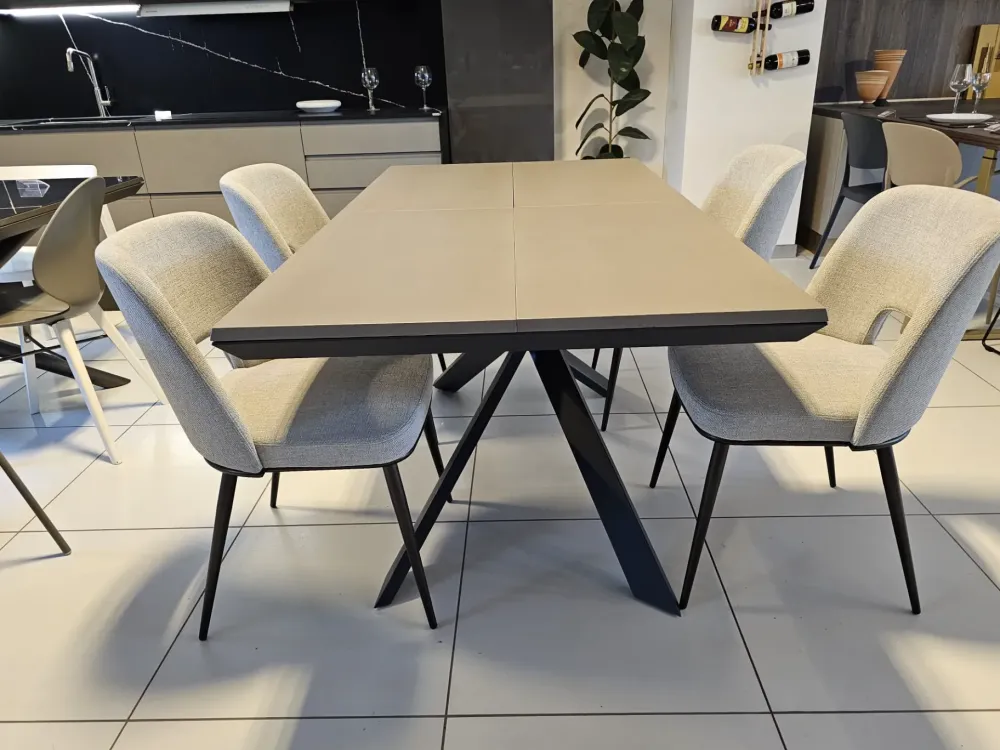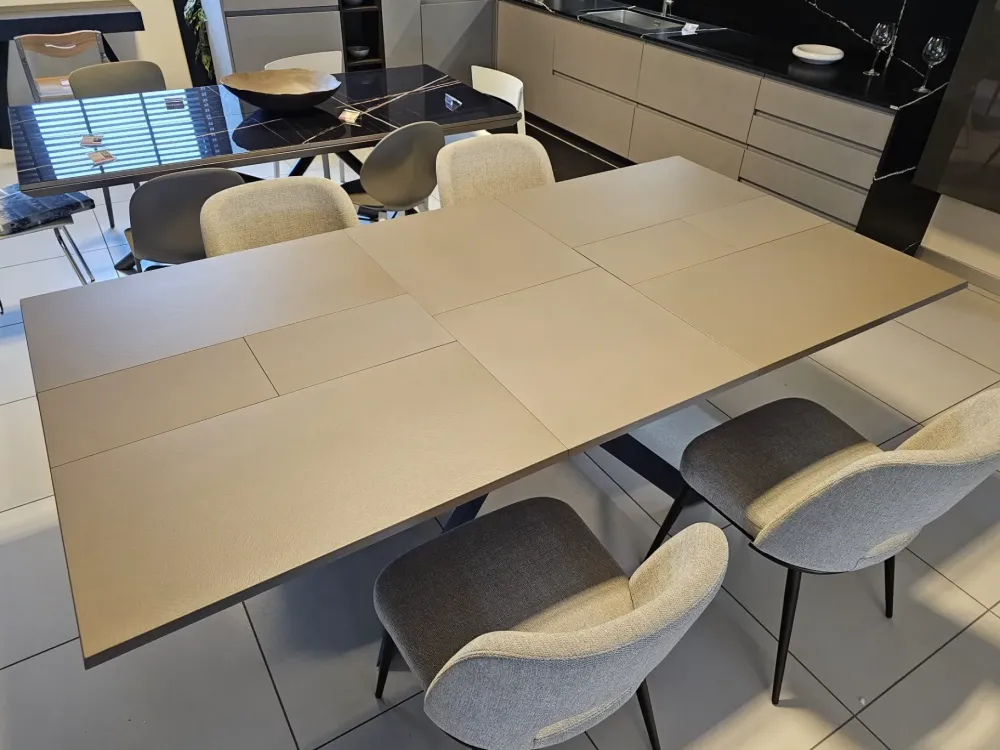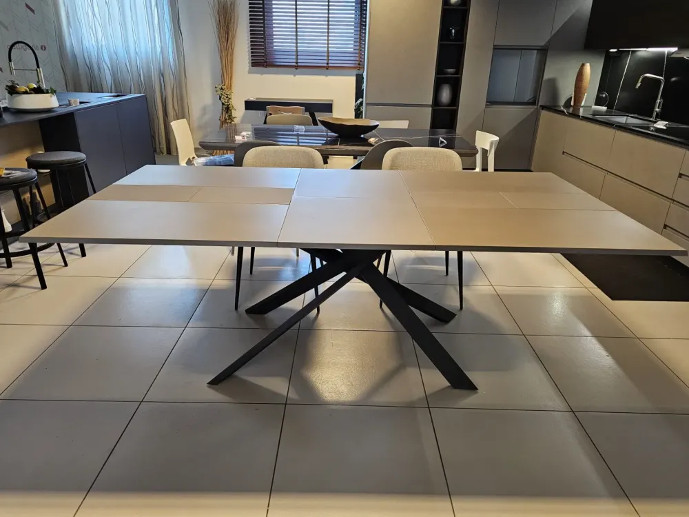 Tavolo allungabile 4×4, sistema unico nel suo genere in quanto si allunga e si allarga nello stesso tempo, piano in finitura cemento tortora CM90, telaio e base in metallo finitura grafite MT98, n.10 posti