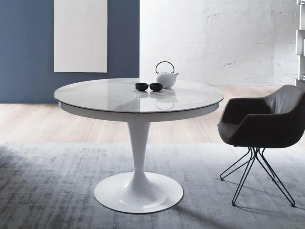 Piano in cristallo, vetro stratificato ceramica o Marble Glass, allunga centrale in nobilitato.