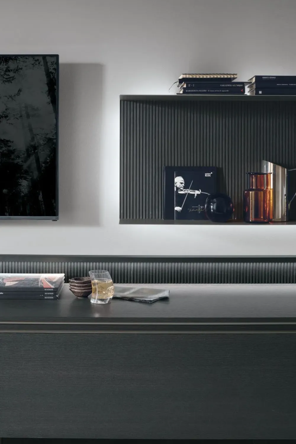 Lo schienale Scenario rialzato delle basi e lo schienale Link con mensole in metallo sono caratterizzati dal legno rovere carbone canettè.