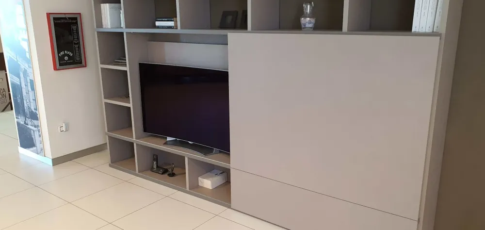 Grazie all’anta scorrevole potrete coprire il televisore quando non in uso e dare spazio alla libreria, che all’occorenza diventa parete soggiorno ospitando il televisore.