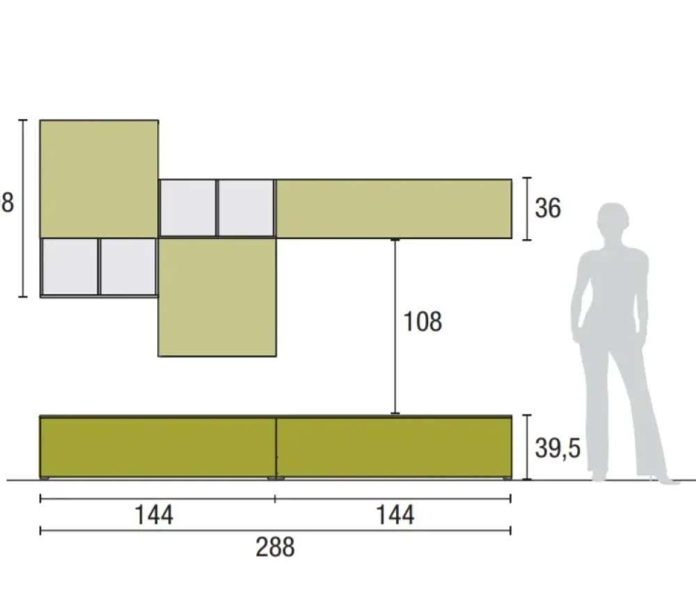 La larghezza della soluzione qui visibile, che va da 251 a 300 cm, è tale da rendere questo modello idoneo ad essere inserito in ambienti di diverse misure.