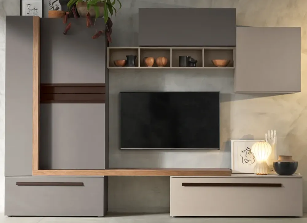 Per il tuo soggiorno abbiamo pensato ad una collezione di mobili e oggetti accessori in laminato opaco, come la parete attrezzata Composizione 15 in offerta, ideale per coniugare doti di funzionalità e stile nel tuo soggiorno.