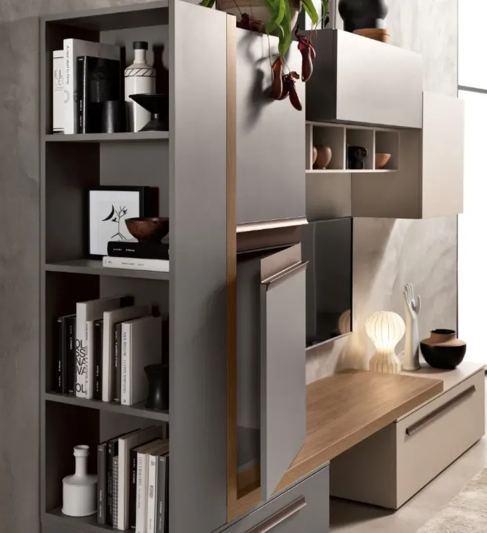 I mobili e oggetti accessori per la zona giorno consentono di customizzare lo spazio dando vita a peculiari atmosfere: se desideri un soggiorno moderno, la parete attrezzata in foto è l’ideale.